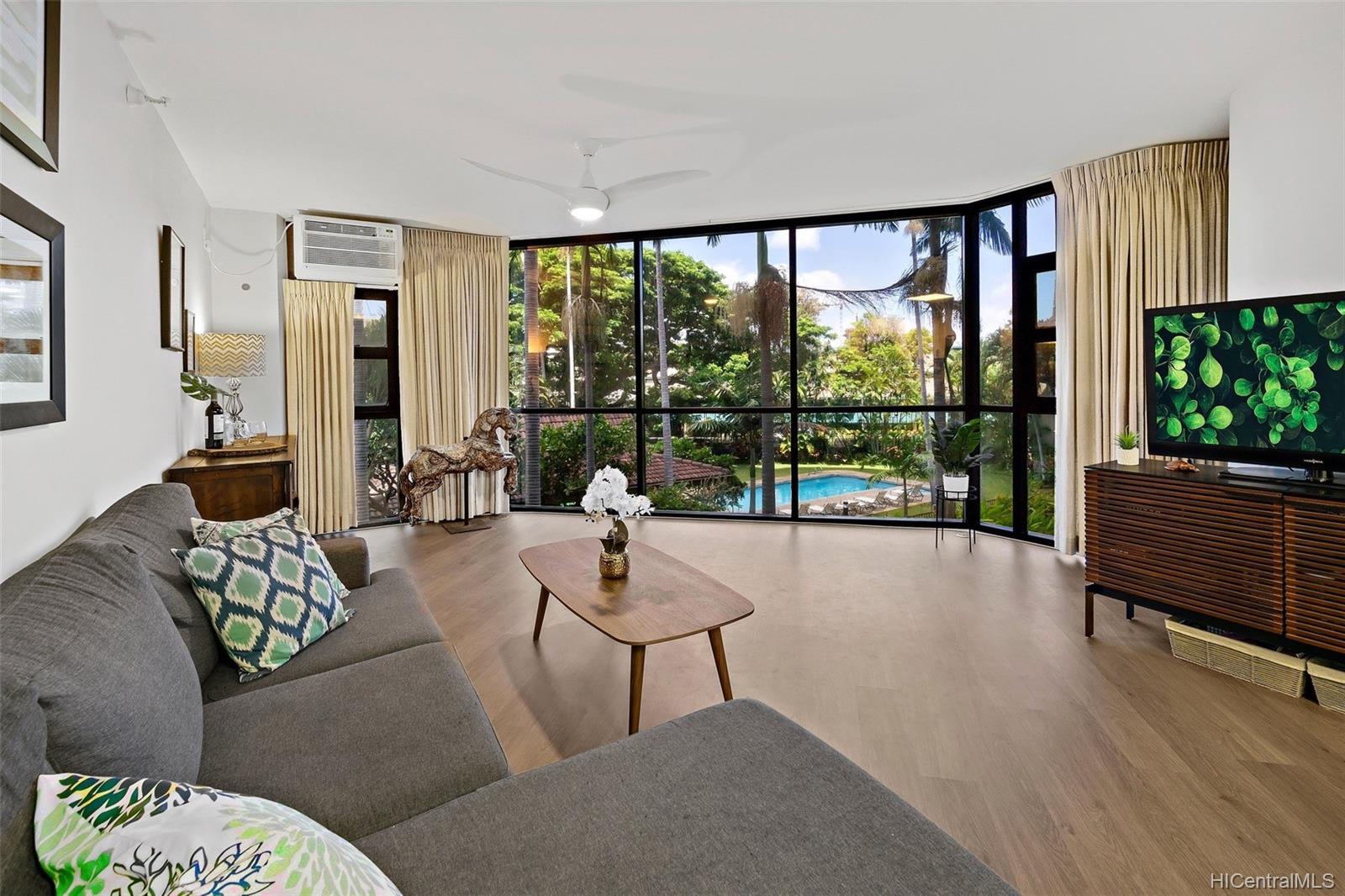 | ELCOME HOME to this stunning 2 bed, 2 bath condo w/ 1 parking stall and washer & dryer in unit. Beautiful and tasteful upgrades include quartz countertops, stainless steel appliances, LED lights, laminate flooring, built in shelving in the master closet, & tinted floor to ceiling windows to enjoy SERENE VIEWS of the lush tropical garden and pool from every room. This quiet, secure, sprinklered, and PET-FRIENDLY building features a cabana, BBQ grills, pool/spa, and koi pond, fully surrounded by well manicured landscaping and calming greenery, perfect for private relaxation or entertaining. Covered parking stall is conveniently located on 2nd floor, same level as the unit itself, providing easy access to the unit. Enjoy the convenience of living in town with Ala Moana Shopping Center, Don Quijote, Sam's Club & Walmart only a short distance away, while basking in this haven of peace and tranquility! | What will it cost to own? | |