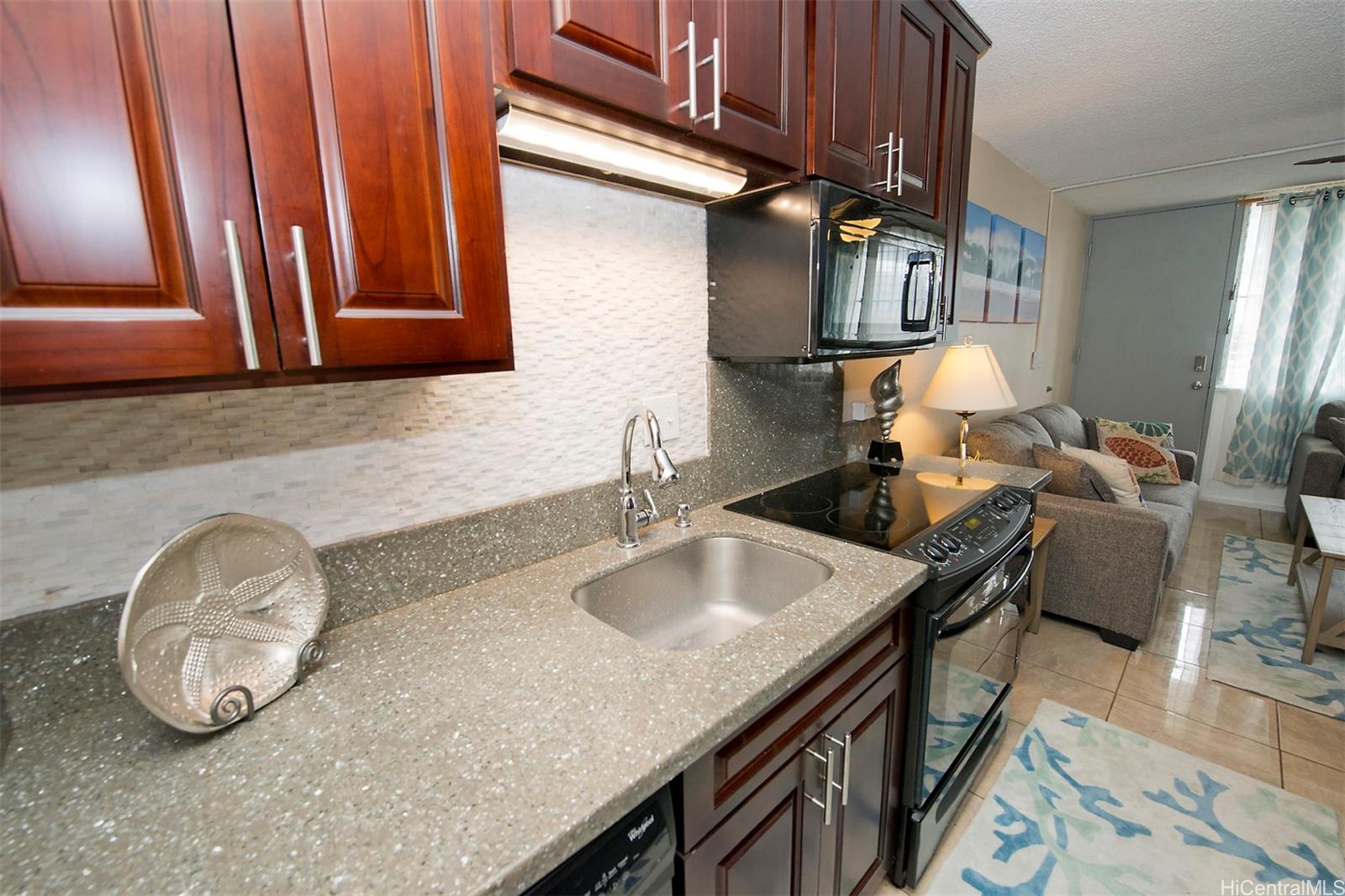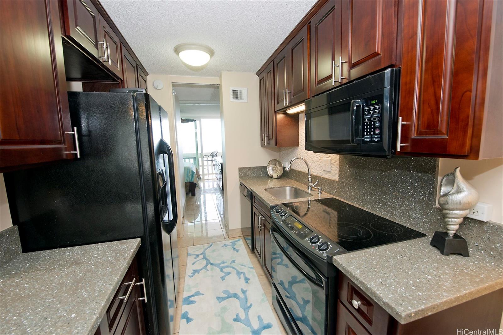 MUST SEE! MOVE-IN READY. Captivating panoramic ocean views from your lanai! Indoor/outdoor living made easy with quality sliding glass doors that stack to one side of the lanai so you can take in unbelievable ocean views and amazing sunsets from this stunning 1 bed, 1 bath unit at Makaha Beach Cabanas! Indulge with refreshing sounds of rolling waves as you enjoy a meal with your favorite beverage on the covered lanai. Relax in the cozy living room or prepare meals in the custom designed kitchen with granite countertops, upgraded cabinetry, newer refrigerator and microwave. Plus, a tankless water heater and updated electrical box. Unit being sold fully furnished! An elevator ride down relocates you to one of the most beautiful beaches on Oahu! Location is key. Just a few minutes' drive to the city of Kapolei where you'll find shopping, dining, entertainment, golf courses, salons and other conveniences. Contact your favorite real estate agent to view. Gated community. Live life today!