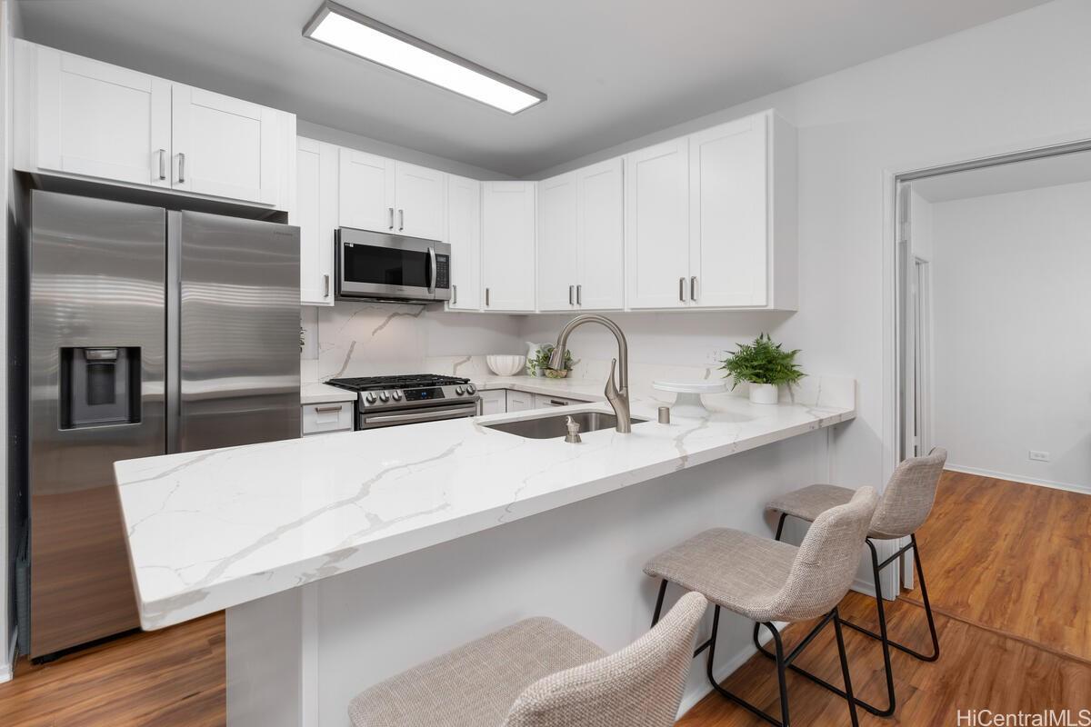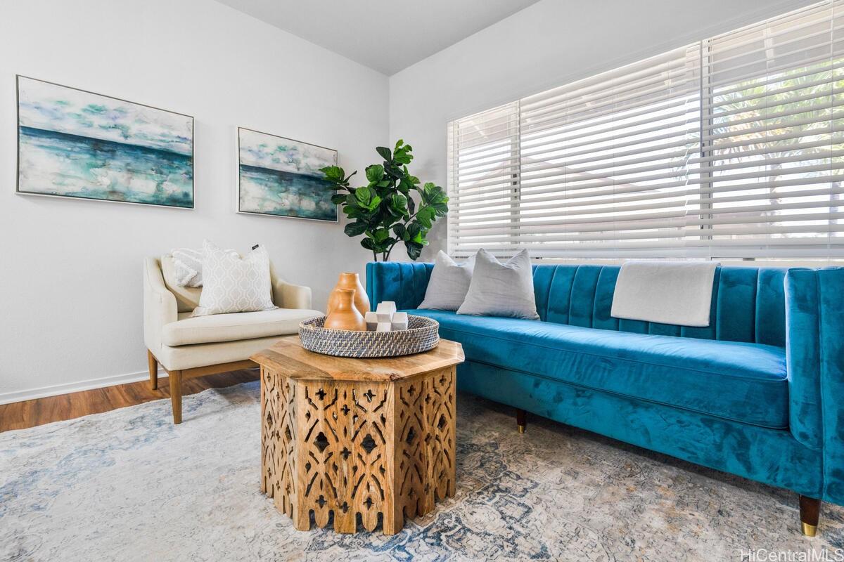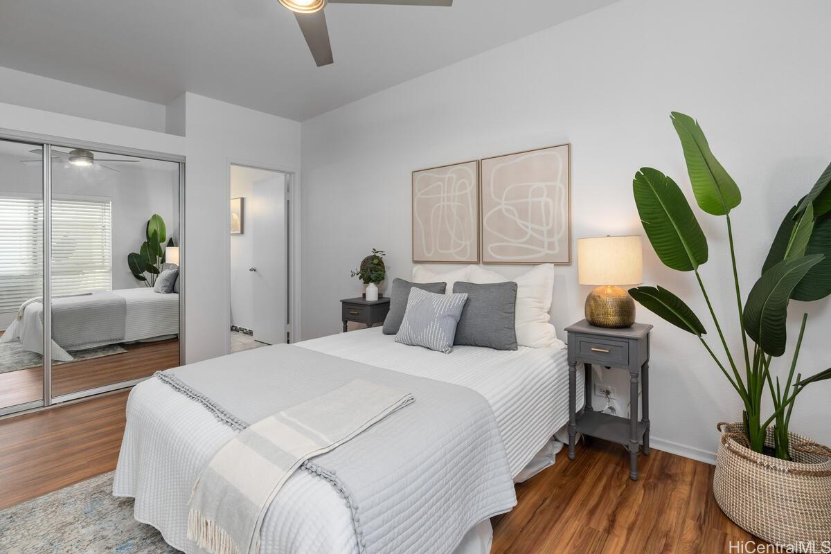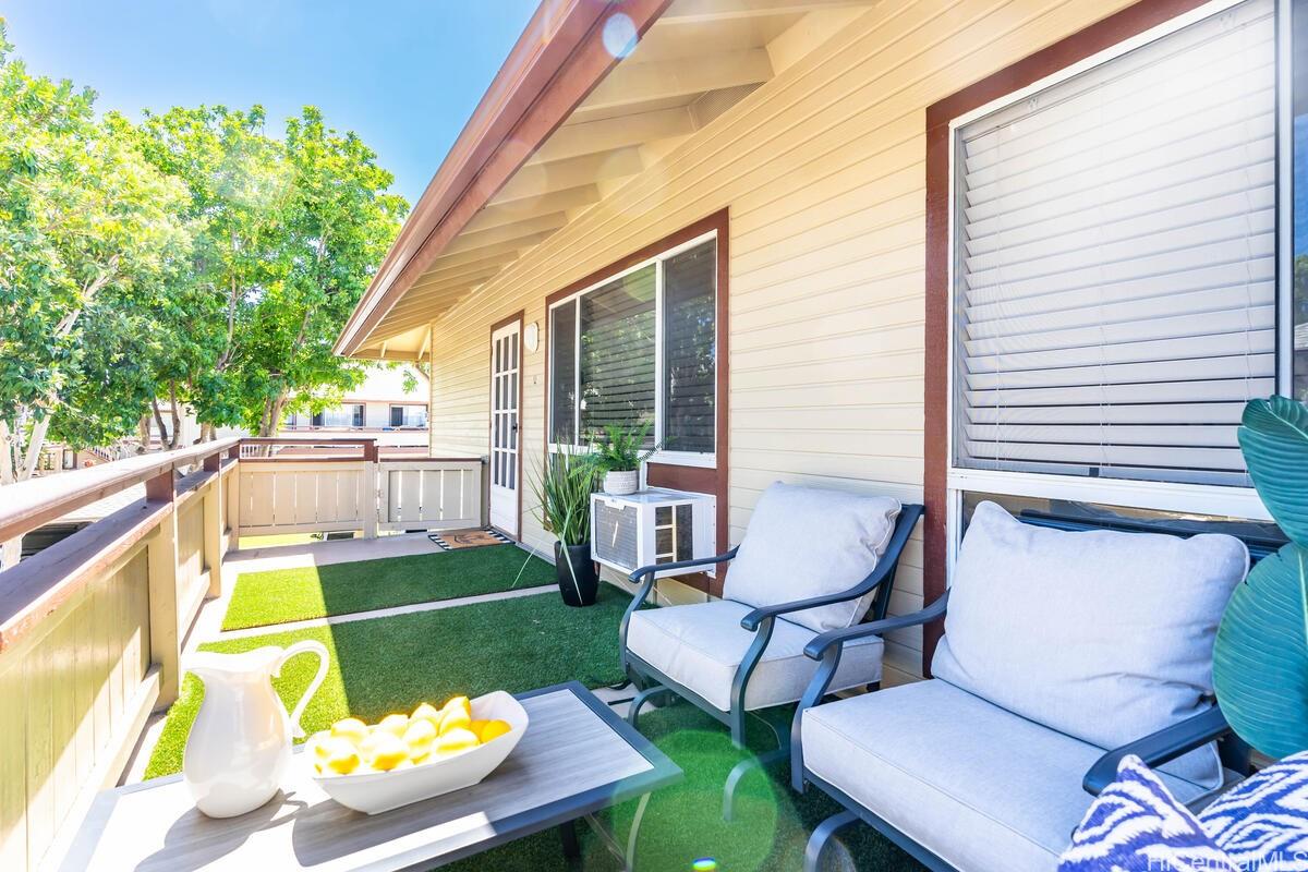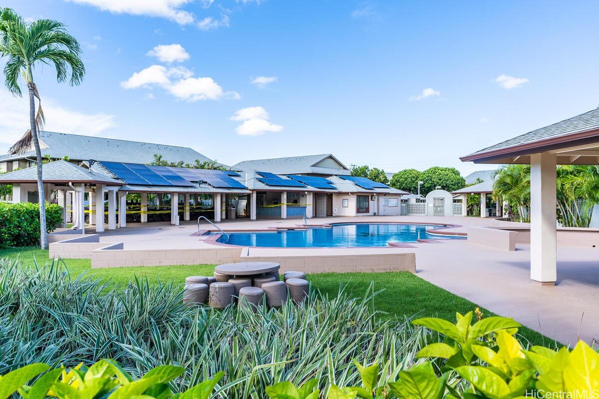 mbrace the charm of this thoughtfully remodeled 2-bedroom, 2-bathroom townhome situated in the coveted gated enclave of Palm Court. This community offers an array of amenities, including a refreshing pool, inviting recreation area, and convenient guest parking. Positioned mere moments from the H-1 freeway access, the vibrant Ka Makana Ali'i shopping center, diverse dining options, sun-kissed beaches, and the full spectrum of attractions that define the Kapolei/Ewa locale. Discover the allure of modern living with an array of updated stainless-steel kitchen appliances at your disposal, including an undermount kitchen sink, dishwasher, gas range, microwave hood, and refrigerator/freezer. The rejuvenated kitchen is complemented by fresh cabinets and drawers, accompanied by elegant luxury vinyl plank flooring and captivating quartz countertops. Step onto the expansive lanai, a haven for both entertainment and relaxation, ideal for unwinding after a busy day. Both bathrooms have been tastefully refurbished, embodying contemporary comfort. With an effortless viewing process, we invite you to experience all that this home has to offer firsthand.