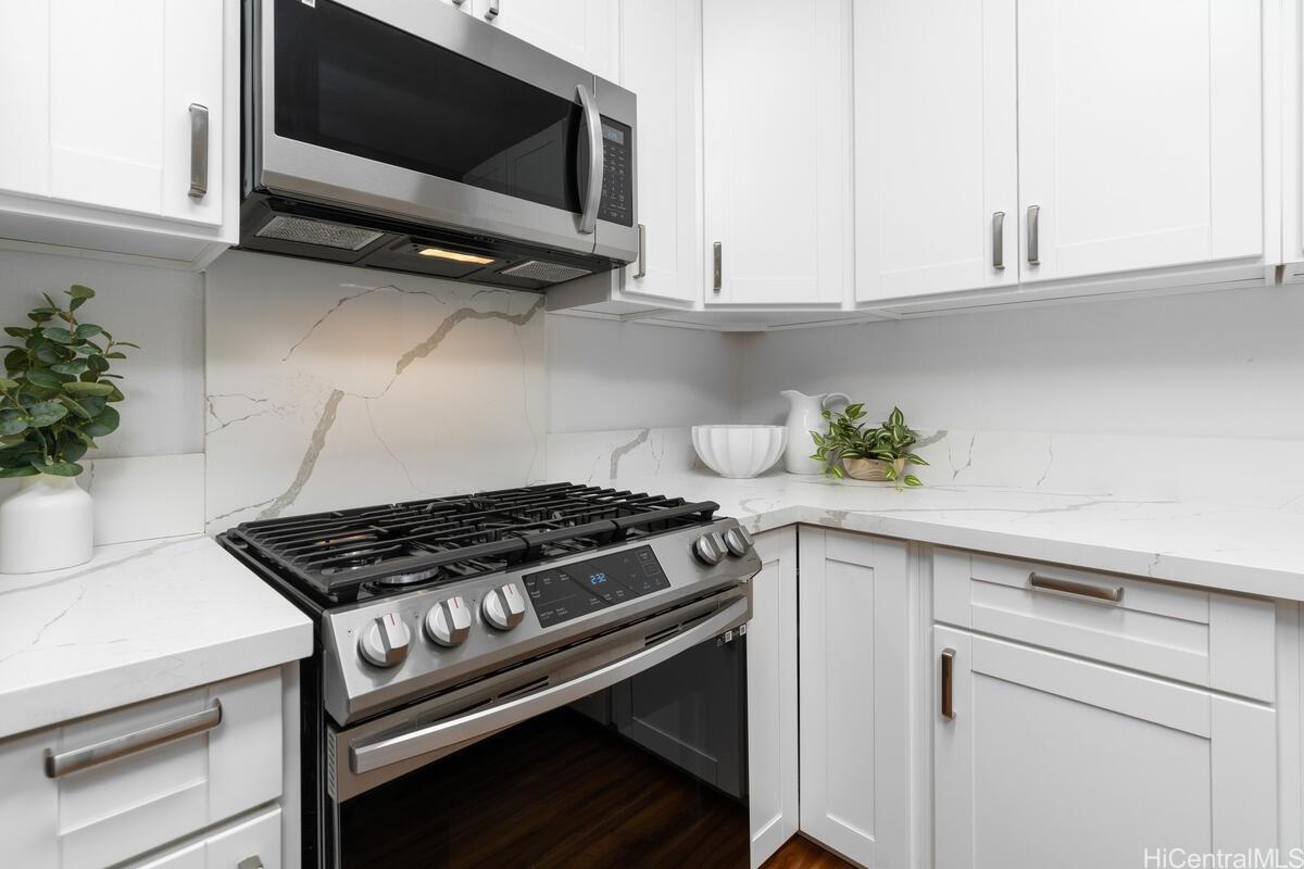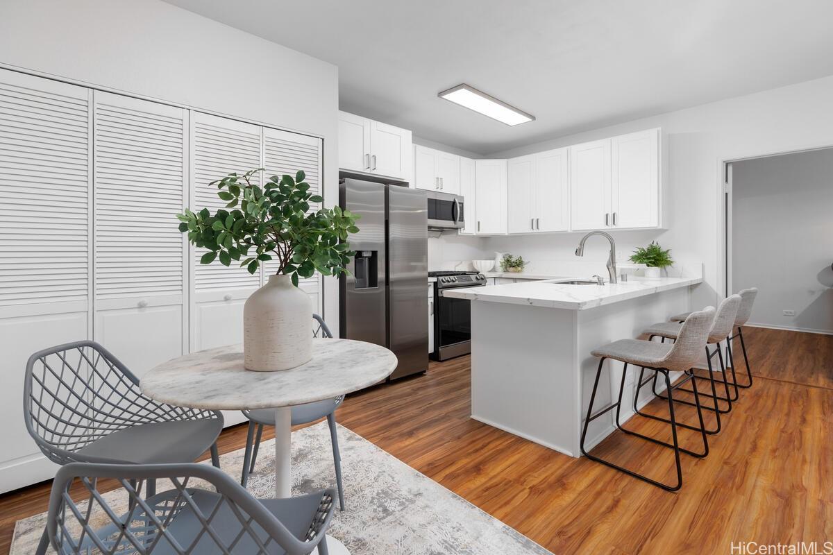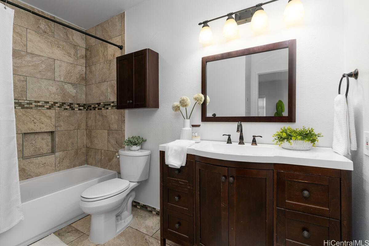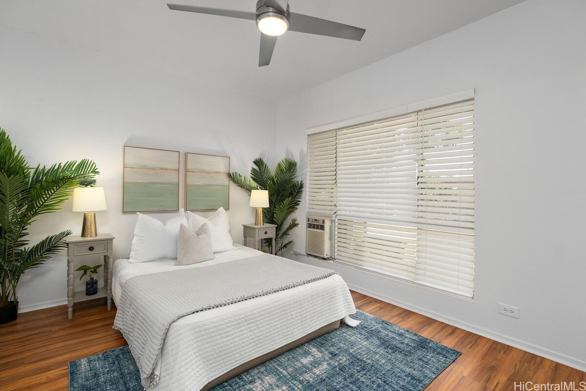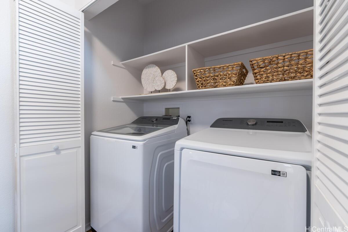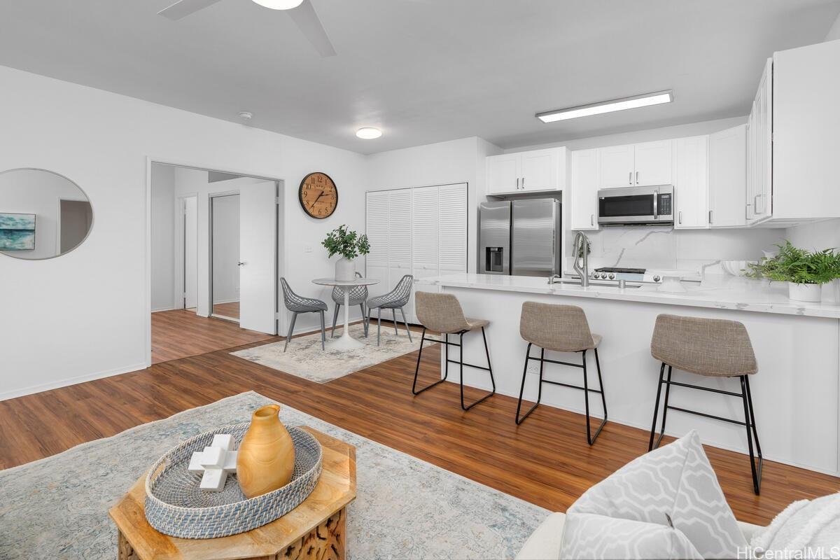 mbrace the charm of this thoughtfully remodeled 2-bedroom, 2-bathroom townhome situated in the coveted gated enclave of Palm Court. This community offers an array of amenities, including a refreshing pool, inviting recreation area, and convenient guest parking. Positioned mere moments from the H-1 freeway access, the vibrant Ka Makana Ali'i shopping center, diverse dining options, sun-kissed beaches, and the full spectrum of attractions that define the Kapolei/Ewa locale. Discover the allure of modern living with an array of updated stainless-steel kitchen appliances at your disposal, including an undermount kitchen sink, dishwasher, gas range, microwave hood, and refrigerator/freezer. The rejuvenated kitchen is complemented by fresh cabinets and drawers, accompanied by elegant luxury vinyl plank flooring and captivating quartz countertops. Step onto the expansive lanai, a haven for both entertainment and relaxation, ideal for unwinding after a busy day. Both bathrooms have been tastefully refurbished, embodying contemporary comfort. With an effortless viewing process, we invite you to experience all that this home has to offer firsthand.