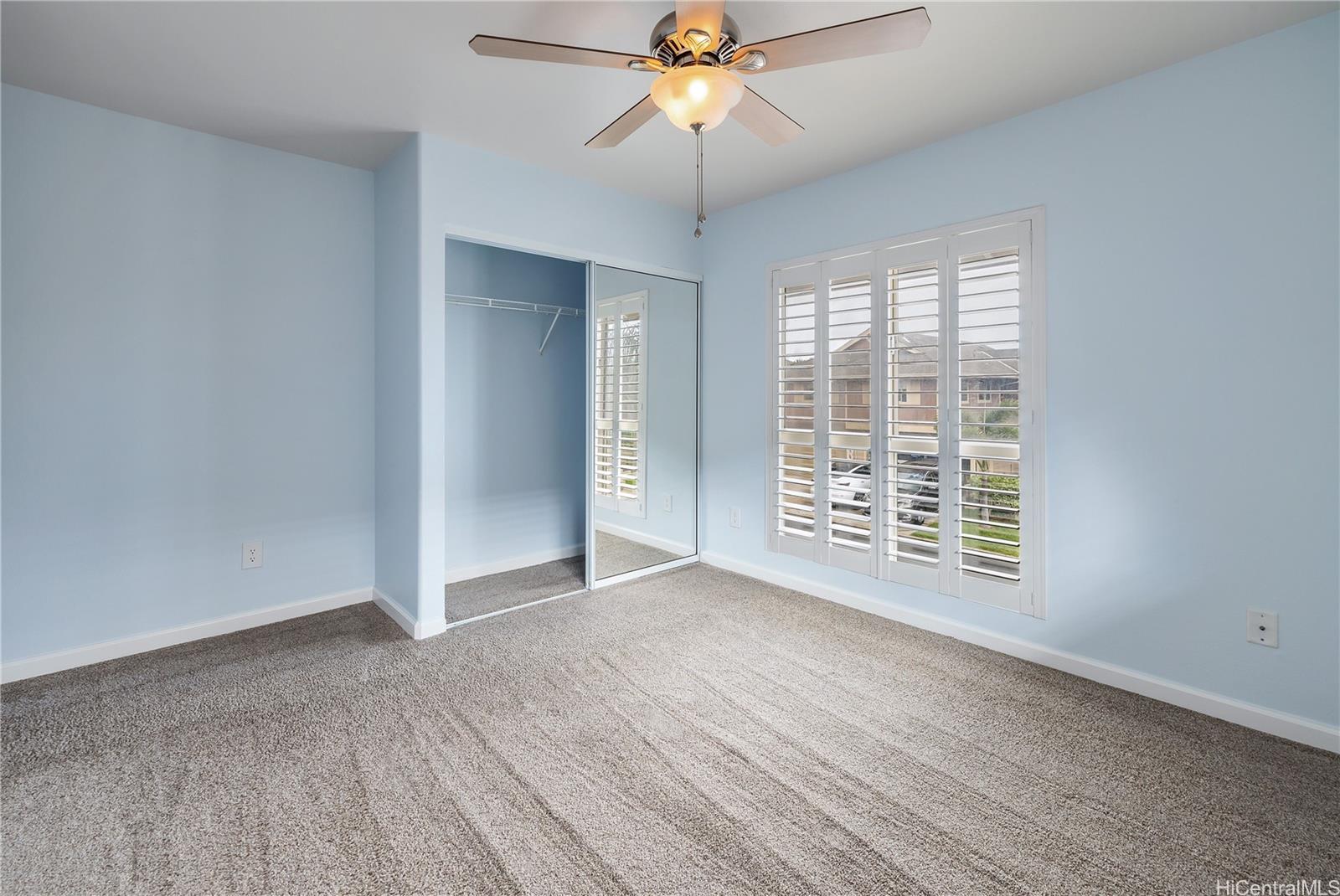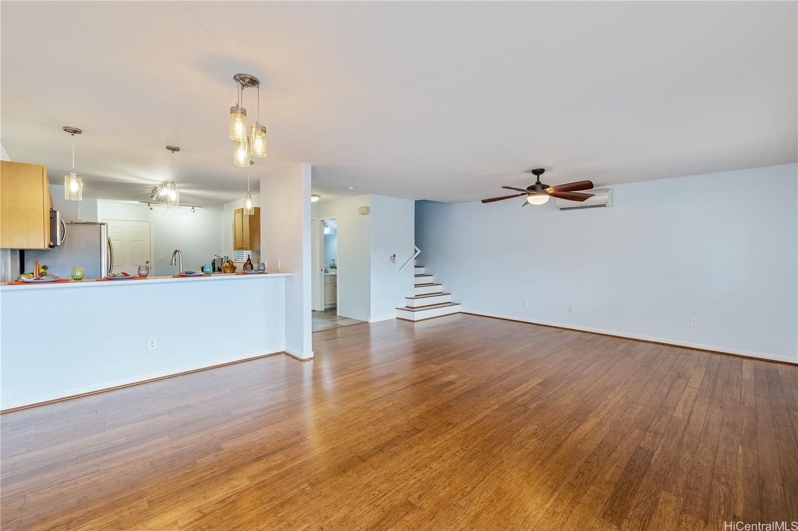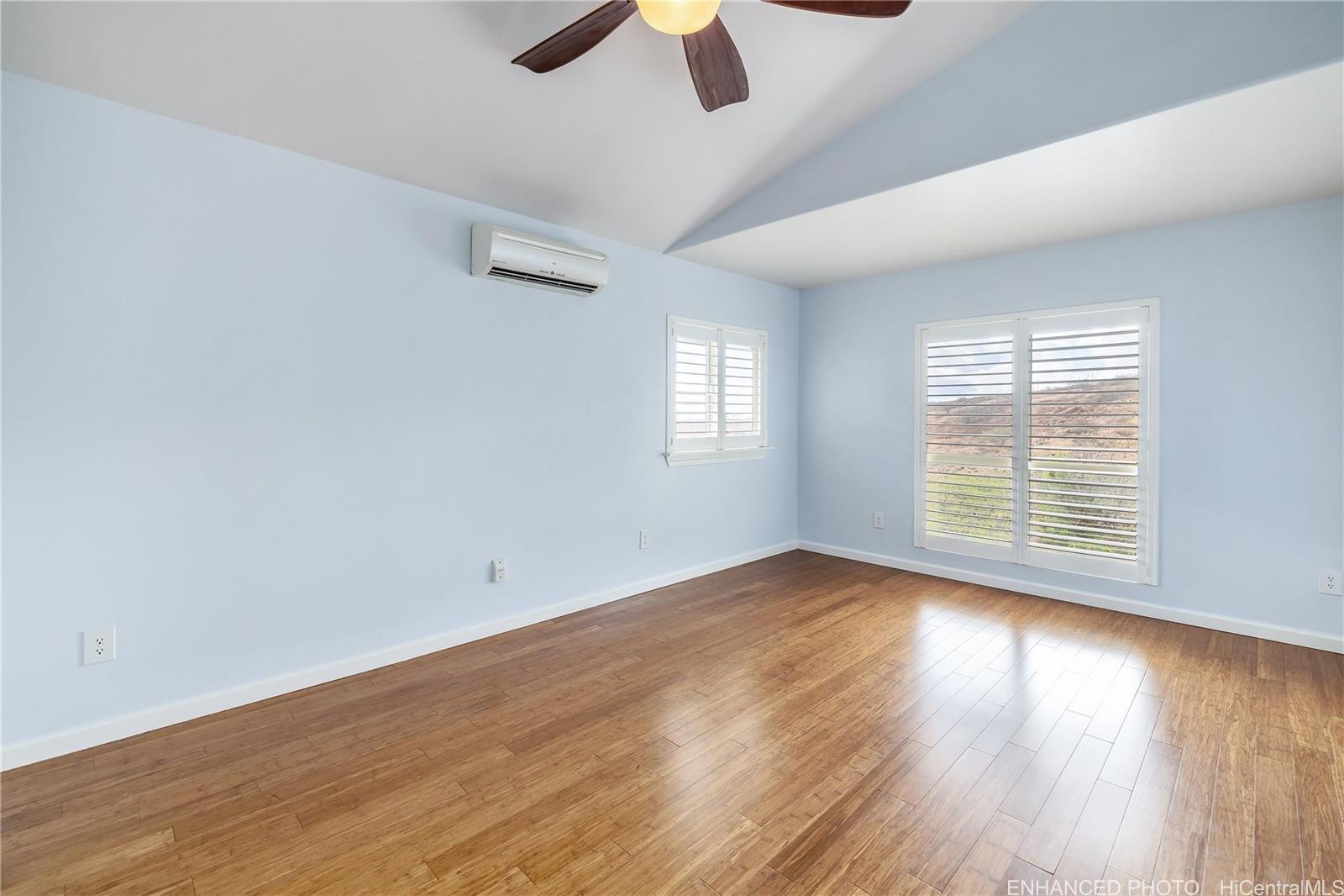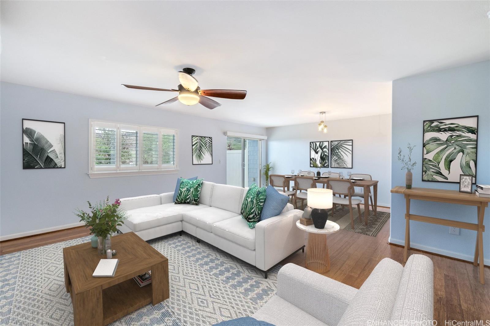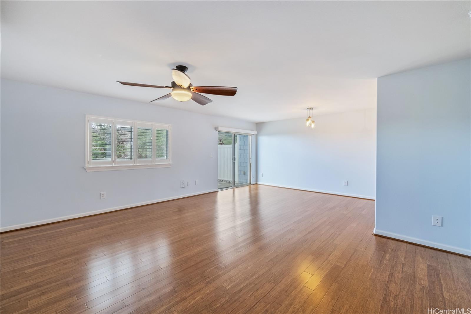 ontemporary Island Living embraces this lovely, light, bright and cheery townhome. Feels like and is bigger than many single-family homes, with 3-bedrooms, 2.5-bathroom with 1529 sq. ft. of interior, plus approximate 400 sq. ft. fenced lanai. The kitchen showcases stainless steel appliances, roomy double door, in kitchen pantry, plus the home boasts bamboo flooring, Stainmaster pet protection carpets, (in 2 bedrooms), plantation shutters, blinds or roller shade throughout. The primary bedroom has an amazing built-in custom closet system, dual vanity ensuite bathroom plus ocean/hillside views. Although Makakilo typically enjoys cooler temperatures and wonderful trades, this home has 4 split AC's for those occasional warmer days, plus ceiling fans throughout. Enjoy private, peaceful hillside and peekaboo ocean views from the lanai with easy care sealed, slate covered lanai flooring. Two vehicle attached garage, with direct in-home access, epoxy plus flecks garage floor, with garage wall/ceiling storage, plus the oversized driveway can accommodate 4 vehicles, depending on size. Well maintained community with guest parking.