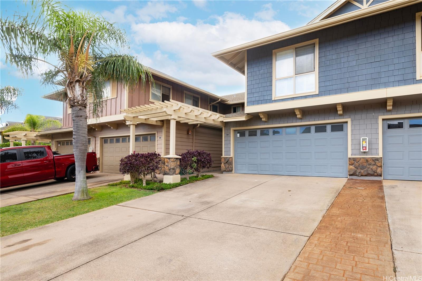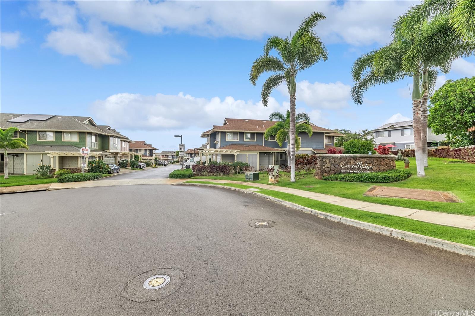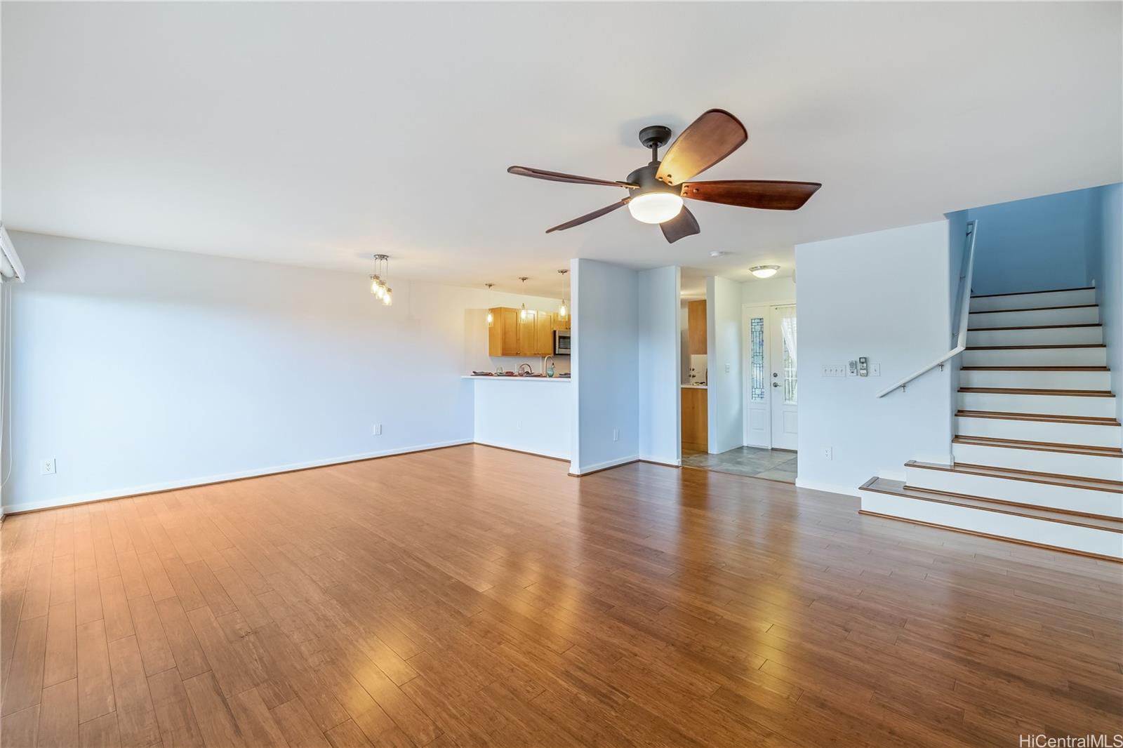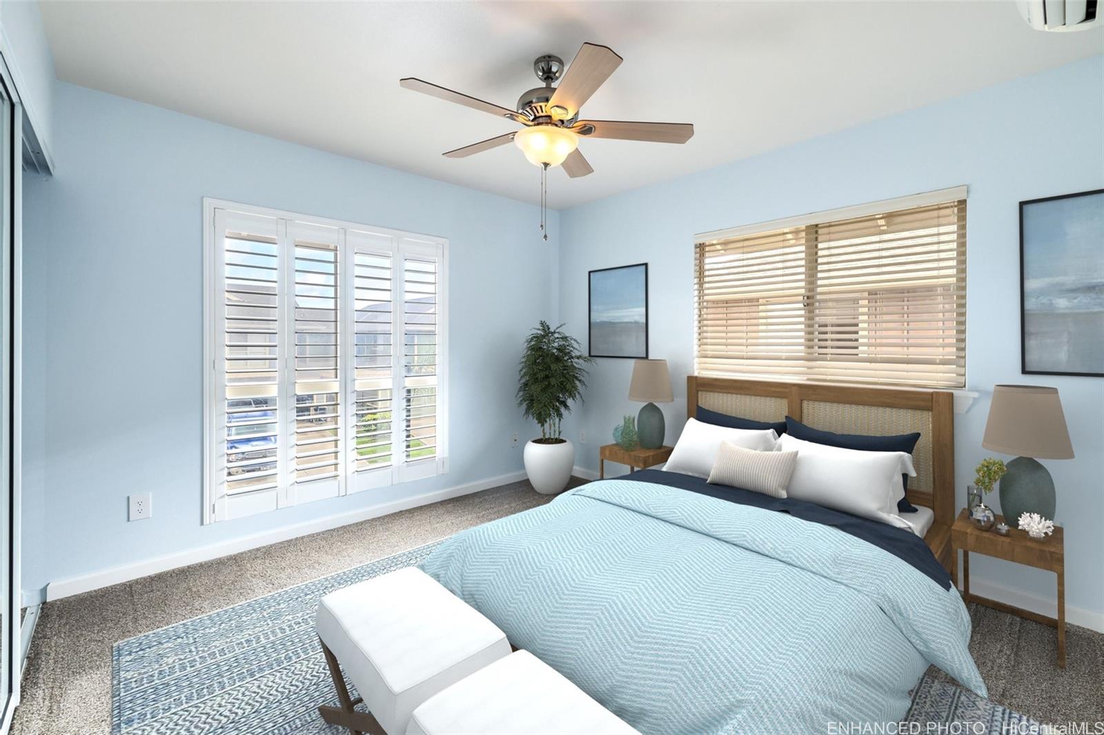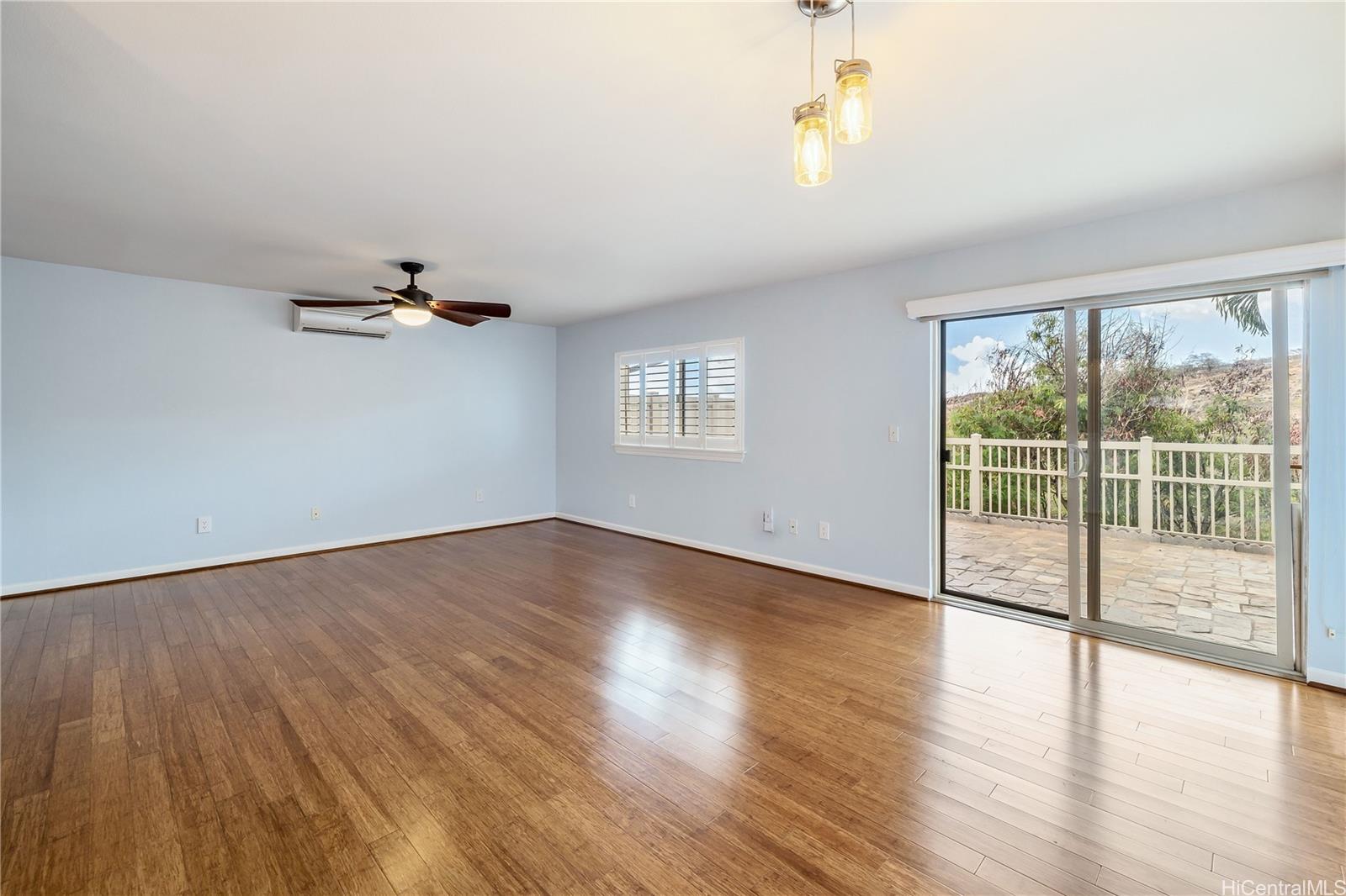 ontemporary Island Living embraces this lovely, light, bright and cheery townhome. Feels like and is bigger than many single-family homes, with 3-bedrooms, 2.5-bathroom with 1529 sq. ft. of interior, plus approximate 400 sq. ft. fenced lanai. The kitchen showcases stainless steel appliances, roomy double door, in kitchen pantry, plus the home boasts bamboo flooring, Stainmaster pet protection carpets, (in 2 bedrooms), plantation shutters, blinds or roller shade throughout. The primary bedroom has an amazing built-in custom closet system, dual vanity ensuite bathroom plus ocean/hillside views. Although Makakilo typically enjoys cooler temperatures and wonderful trades, this home has 4 split AC's for those occasional warmer days, plus ceiling fans throughout. Enjoy private, peaceful hillside and peekaboo ocean views from the lanai with easy care sealed, slate covered lanai flooring. Two vehicle attached garage, with direct in-home access, epoxy plus flecks garage floor, with garage wall/ceiling storage, plus the oversized driveway can accommodate 4 vehicles, depending on size. Well maintained community with guest parking.