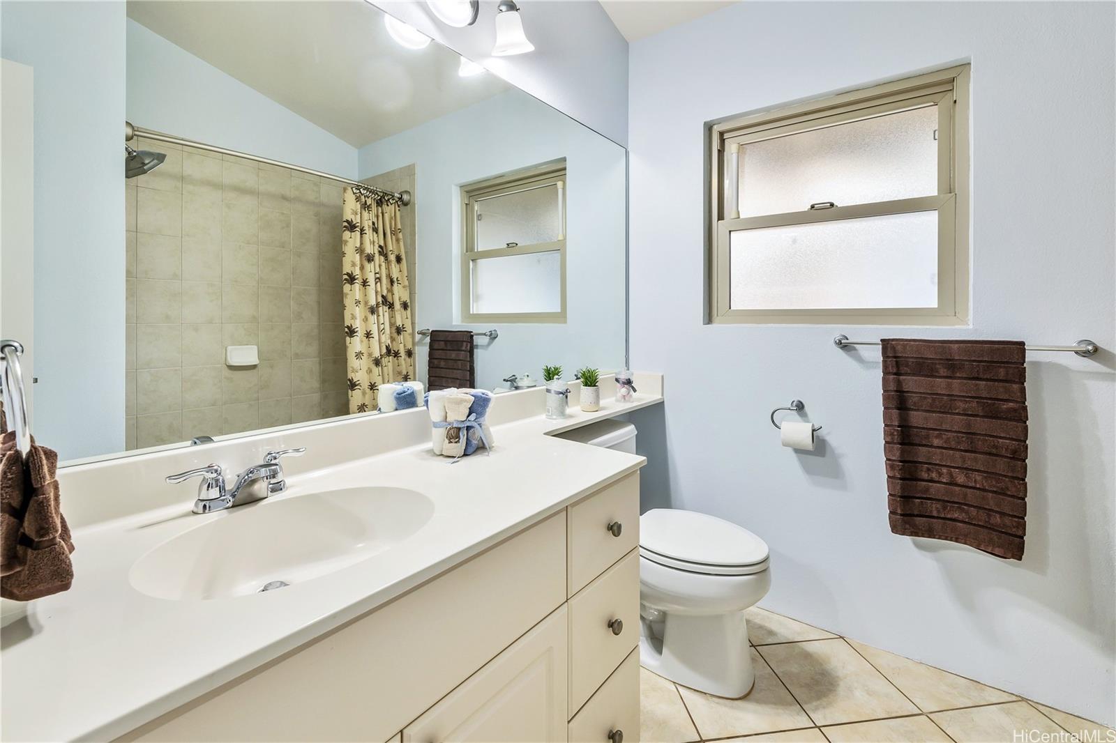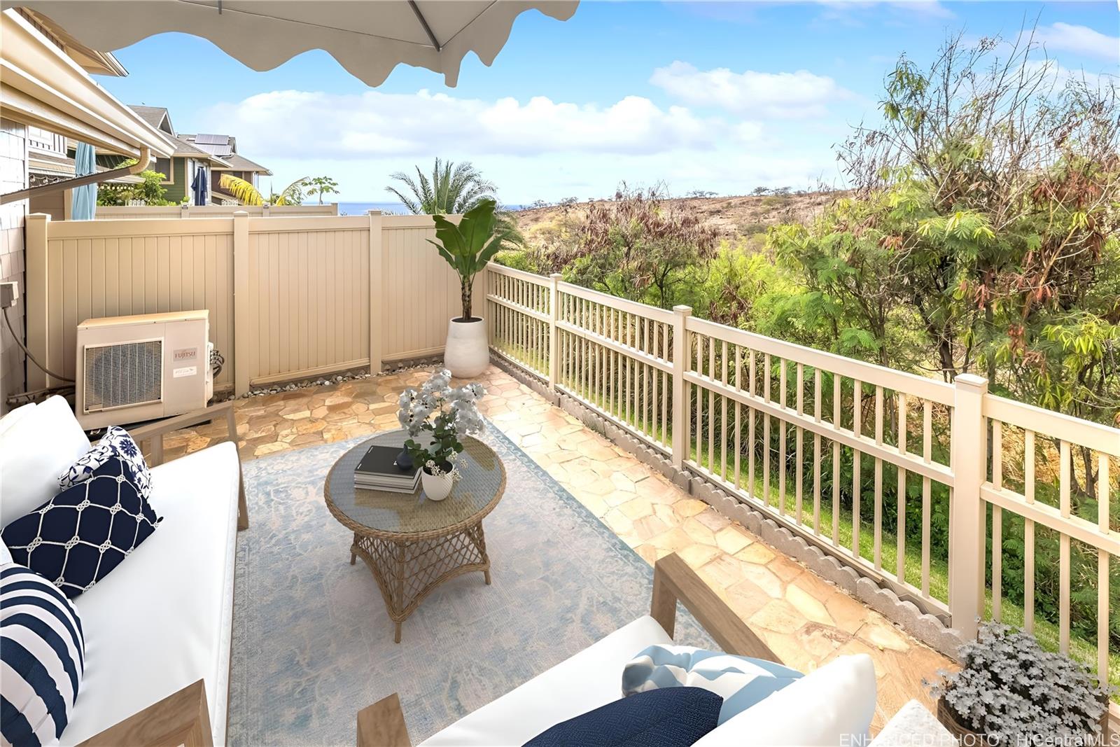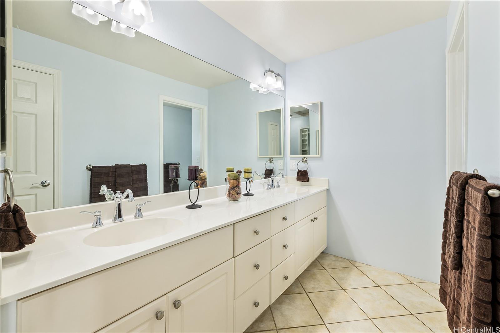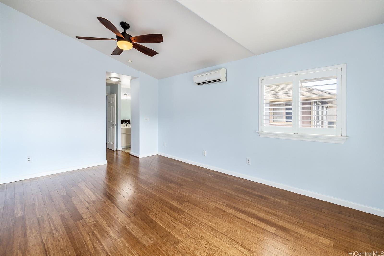 ontemporary Island Living embraces this lovely, light, bright and cheery townhome. Feels like and is bigger than many single-family homes, with 3-bedrooms, 2.5-bathroom with 1529 sq. ft. of interior, plus approximate 400 sq. ft. fenced lanai. The kitchen showcases stainless steel appliances, roomy double door, in kitchen pantry, plus the home boasts bamboo flooring, Stainmaster pet protection carpets, (in 2 bedrooms), plantation shutters, blinds or roller shade throughout. The primary bedroom has an amazing built-in custom closet system, dual vanity ensuite bathroom plus ocean/hillside views. Although Makakilo typically enjoys cooler temperatures and wonderful trades, this home has 4 split AC's for those occasional warmer days, plus ceiling fans throughout. Enjoy private, peaceful hillside and peekaboo ocean views from the lanai with easy care sealed, slate covered lanai flooring. Two vehicle attached garage, with direct in-home access, epoxy plus flecks garage floor, with garage wall/ceiling storage, plus the oversized driveway can accommodate 4 vehicles, depending on size. Well maintained community with guest parking.