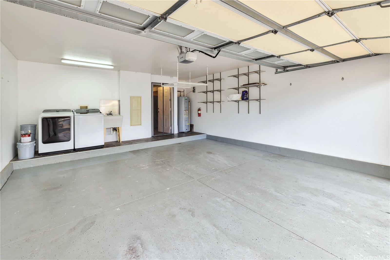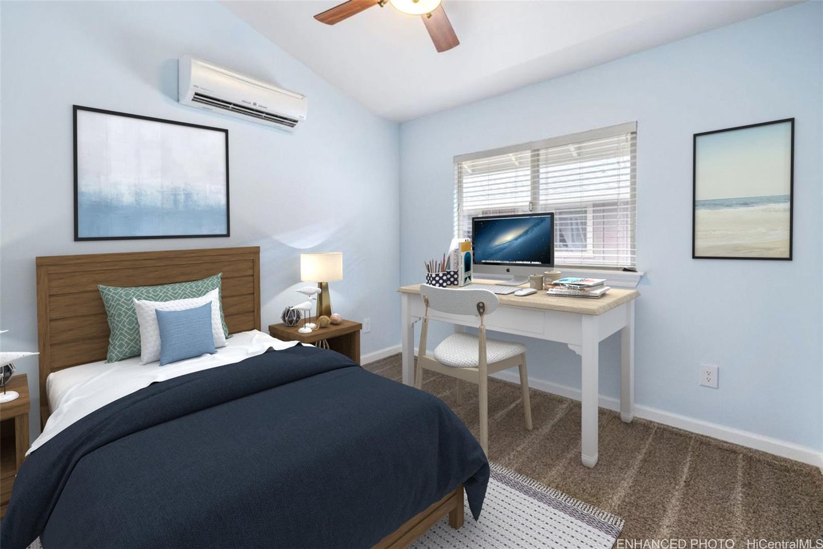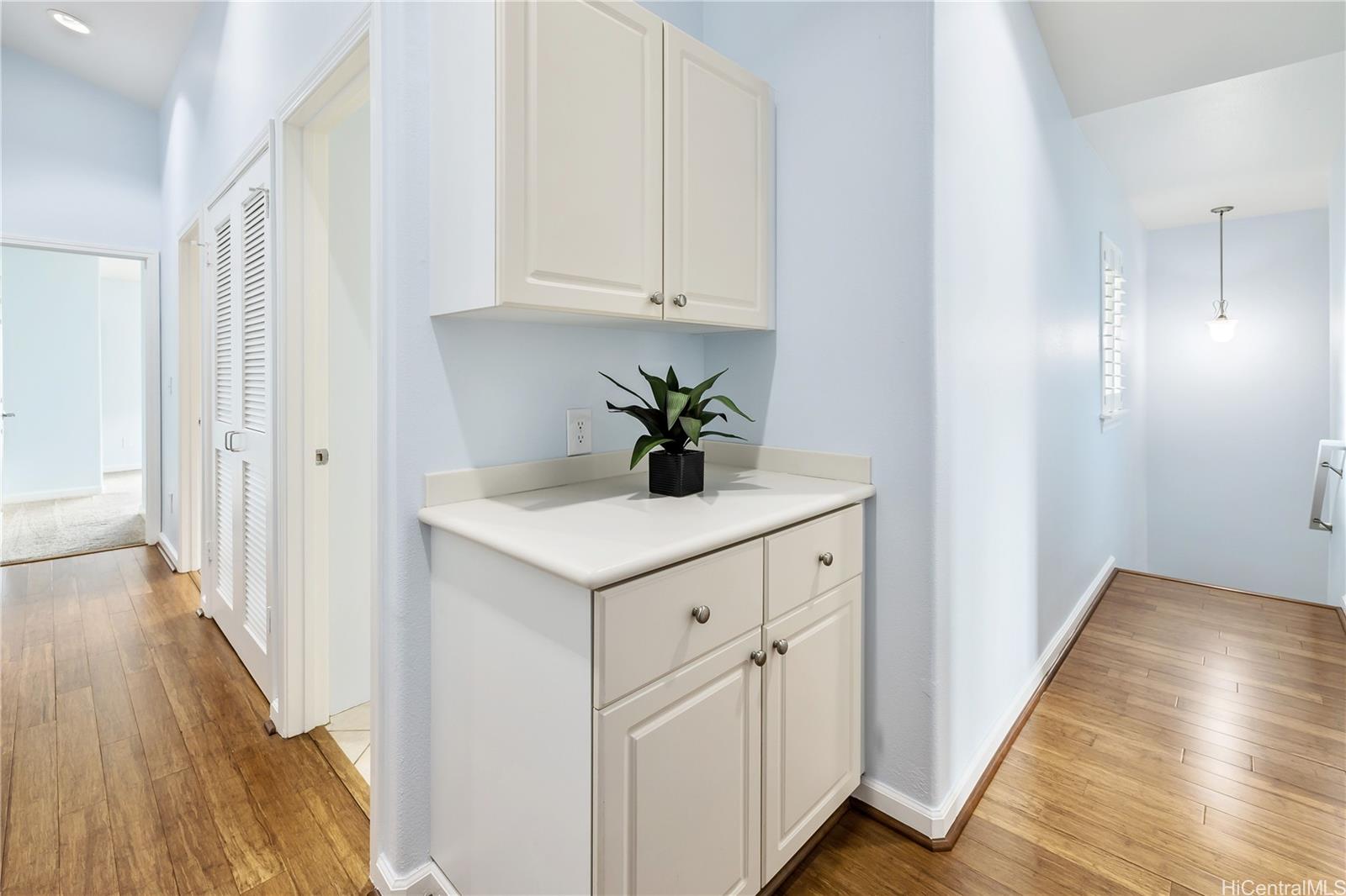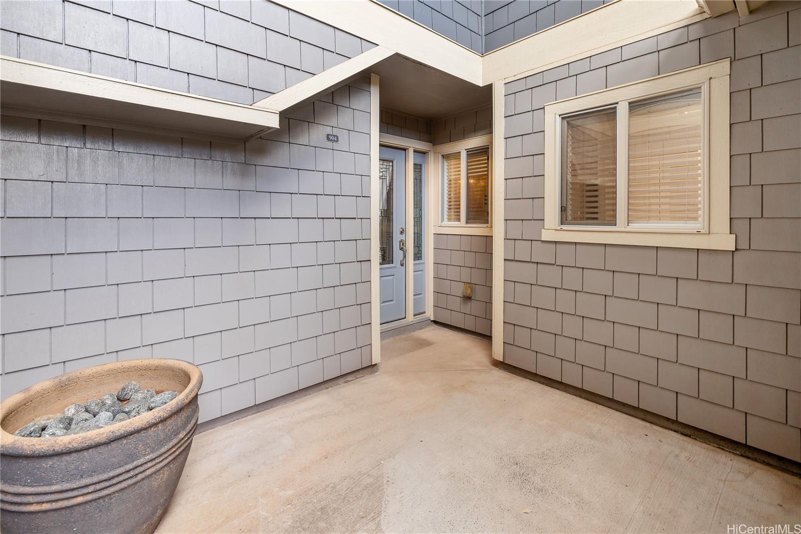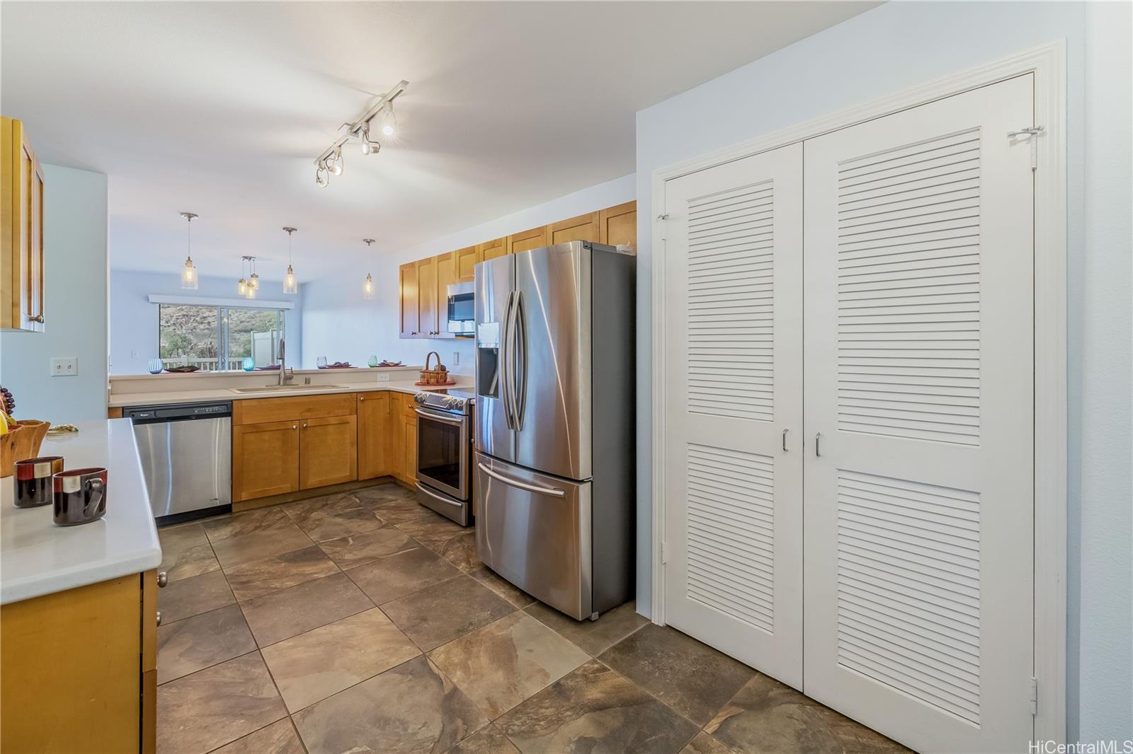 ontemporary Island Living embraces this lovely, light, bright and cheery townhome. Feels like and is bigger than many single-family homes, with 3-bedrooms, 2.5-bathroom with 1529 sq. ft. of interior, plus approximate 400 sq. ft. fenced lanai. The kitchen showcases stainless steel appliances, roomy double door, in kitchen pantry, plus the home boasts bamboo flooring, Stainmaster pet protection carpets, (in 2 bedrooms), plantation shutters, blinds or roller shade throughout. The primary bedroom has an amazing built-in custom closet system, dual vanity ensuite bathroom plus ocean/hillside views. Although Makakilo typically enjoys cooler temperatures and wonderful trades, this home has 4 split AC's for those occasional warmer days, plus ceiling fans throughout. Enjoy private, peaceful hillside and peekaboo ocean views from the lanai with easy care sealed, slate covered lanai flooring. Two vehicle attached garage, with direct in-home access, epoxy plus flecks garage floor, with garage wall/ceiling storage, plus the oversized driveway can accommodate 4 vehicles, depending on size. Well maintained community with guest parking.