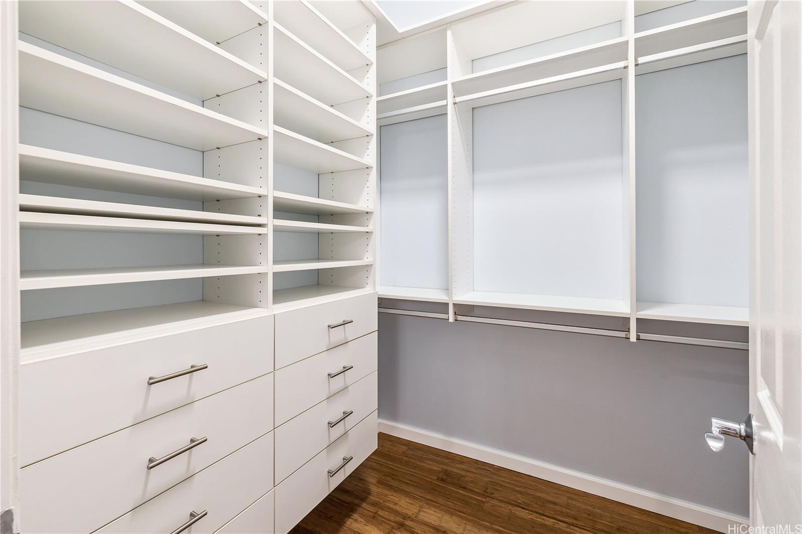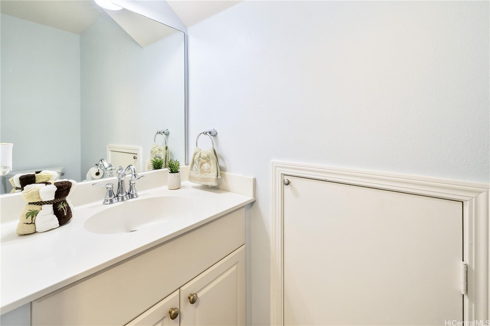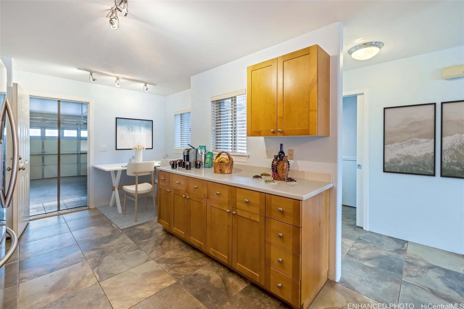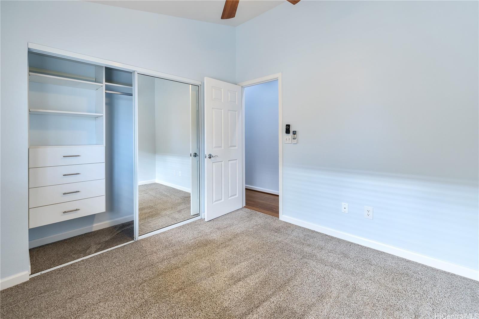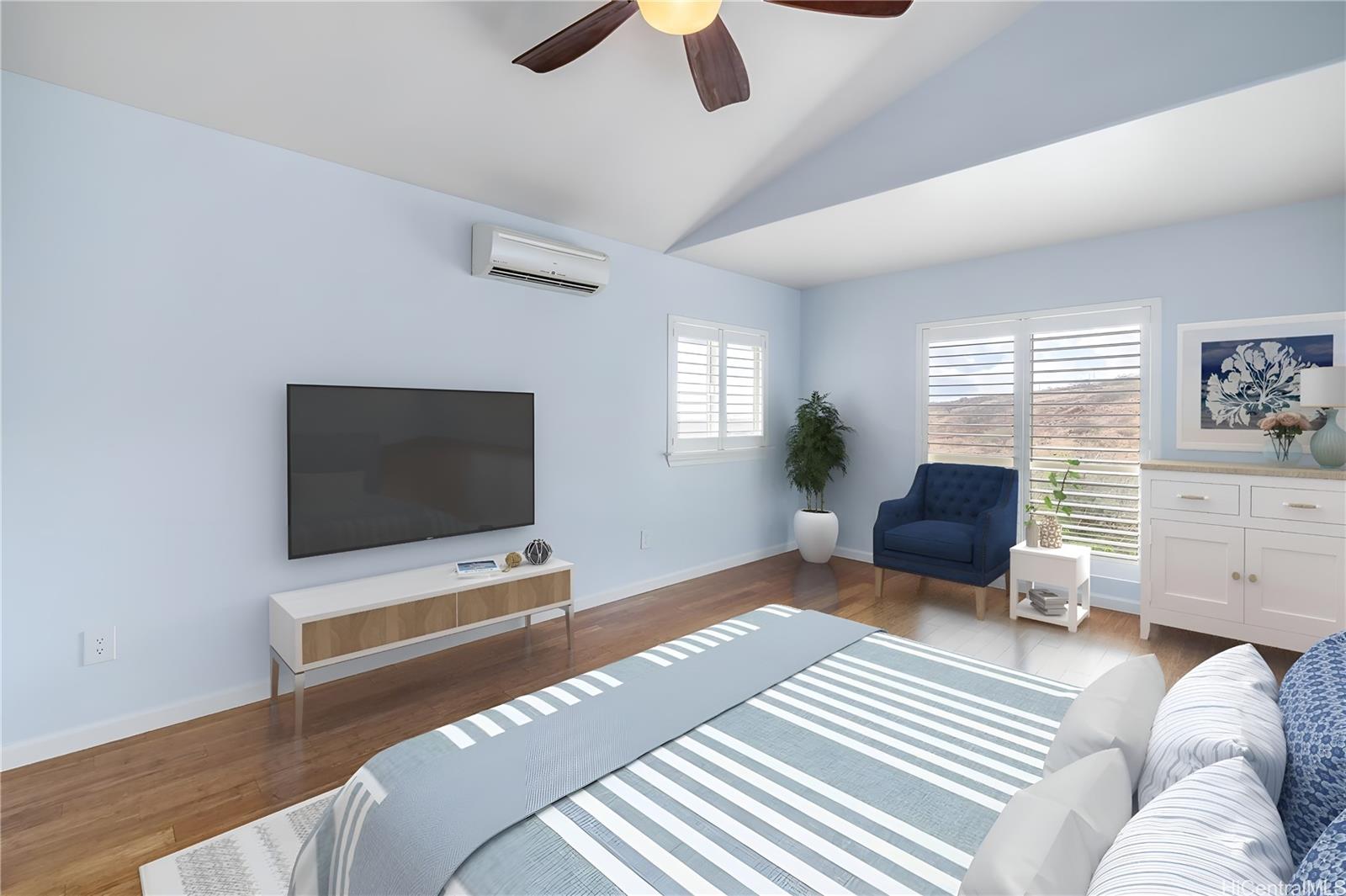 ontemporary Island Living embraces this lovely, light, bright and cheery townhome. Feels like and is bigger than many single-family homes, with 3-bedrooms, 2.5-bathroom with 1529 sq. ft. of interior, plus approximate 400 sq. ft. fenced lanai. The kitchen showcases stainless steel appliances, roomy double door, in kitchen pantry, plus the home boasts bamboo flooring, Stainmaster pet protection carpets, (in 2 bedrooms), plantation shutters, blinds or roller shade throughout. The primary bedroom has an amazing built-in custom closet system, dual vanity ensuite bathroom plus ocean/hillside views. Although Makakilo typically enjoys cooler temperatures and wonderful trades, this home has 4 split AC's for those occasional warmer days, plus ceiling fans throughout. Enjoy private, peaceful hillside and peekaboo ocean views from the lanai with easy care sealed, slate covered lanai flooring. Two vehicle attached garage, with direct in-home access, epoxy plus flecks garage floor, with garage wall/ceiling storage, plus the oversized driveway can accommodate 4 vehicles, depending on size. Well maintained community with guest parking.