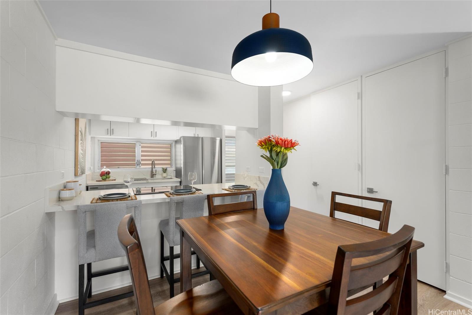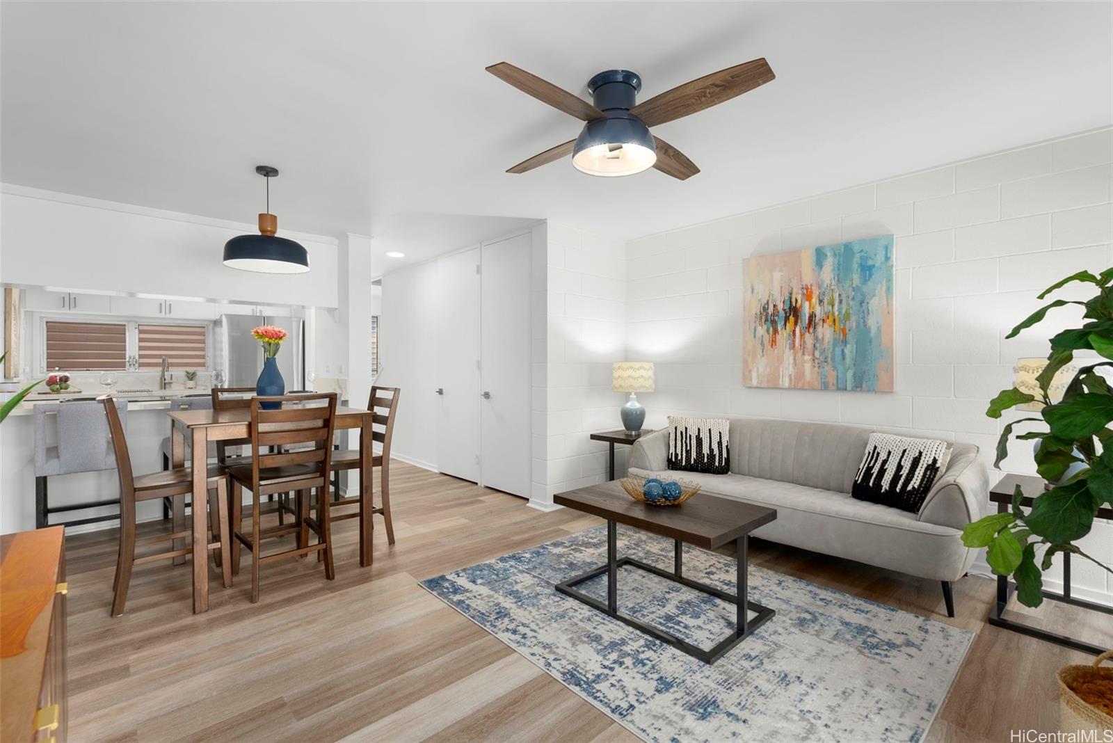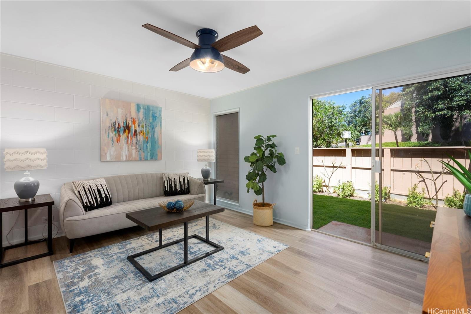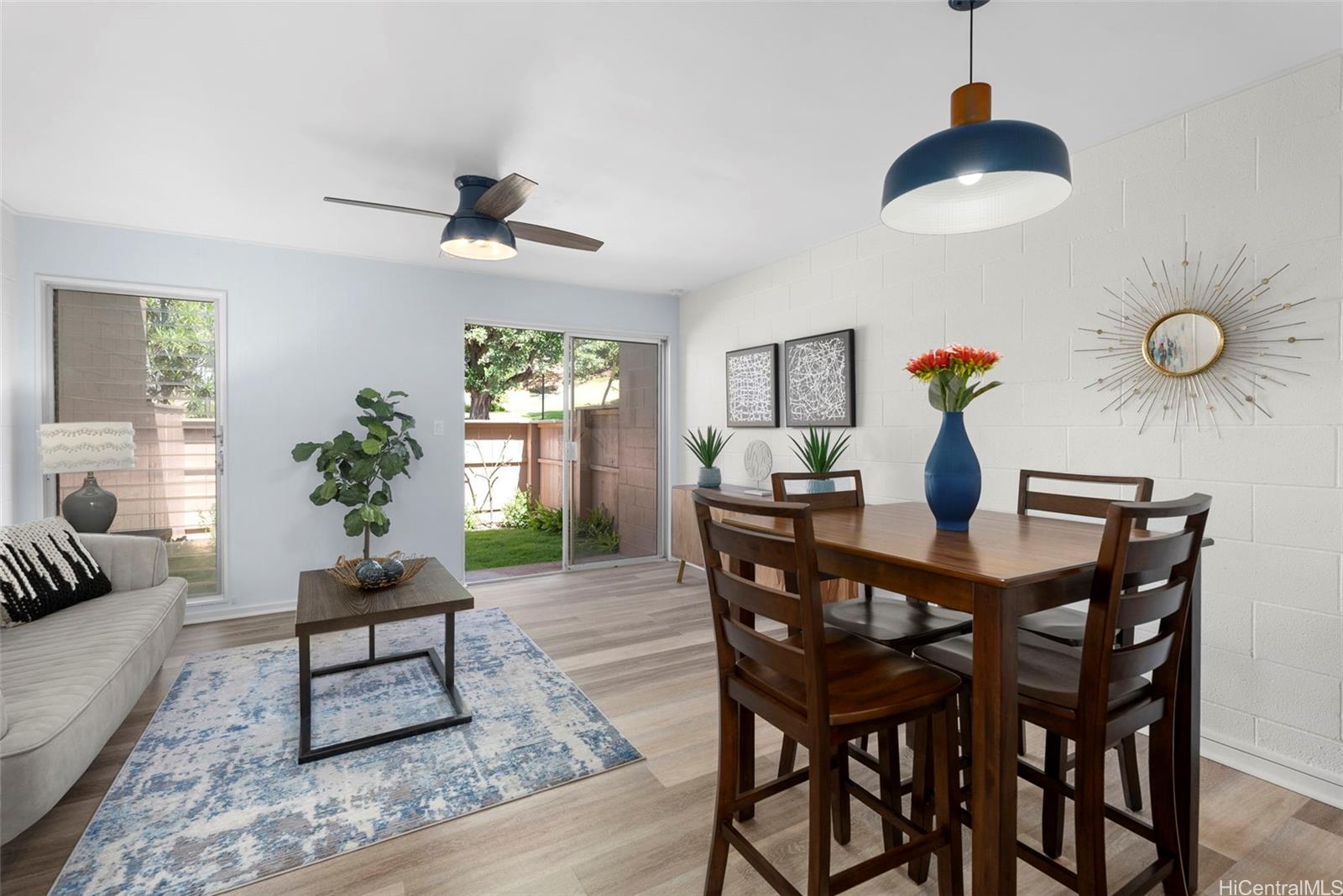 | RAND NEW, HIGH-END RENOVATIONS at this split-level 2 bed, 1 bath, and 1 pkg townhome in Makakilo! This modern renovation includes luxury vinyl plank, matte cabinets, quartz countertops, smooth ceilings, as well as new stainless-steel appliances. The kitchen flows nicely into the dining and living space, while still maximizing storage in the kitchen. Sliding doors from your living space flow out into a newly sodded enclosed yard space, perfect for entertaining, for kids, or for pets! Every renovation and fixture has been thoughtfully chosen, you won't want to miss this! The split-level nature of this unit provides extra privacy with no one else above or below you. Makakilo Gardens is an excellent complex with on-site resident manager, pool, & $.56/sq ft maintenance fees! | What will it cost to own? | |