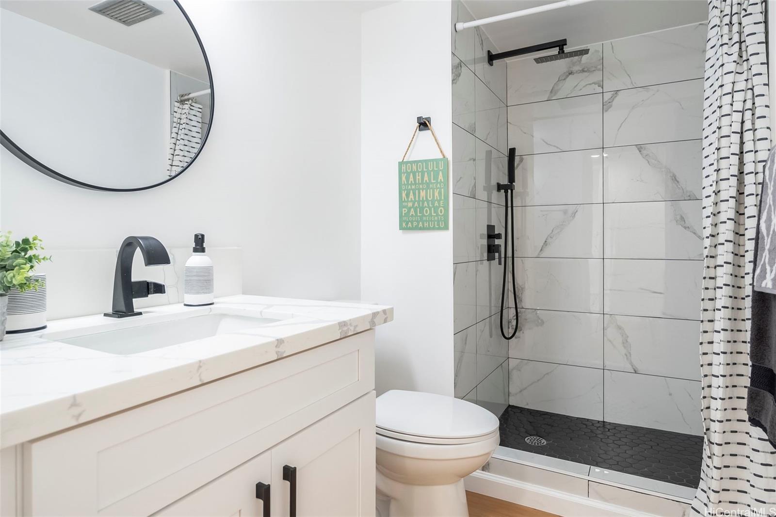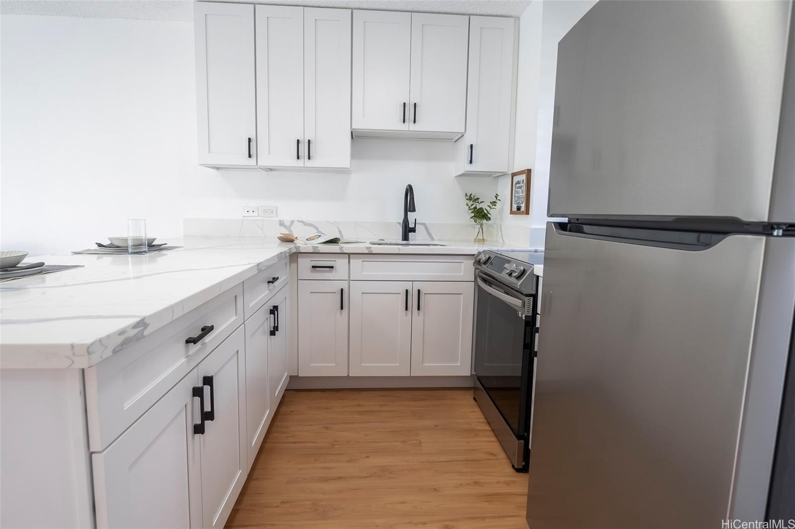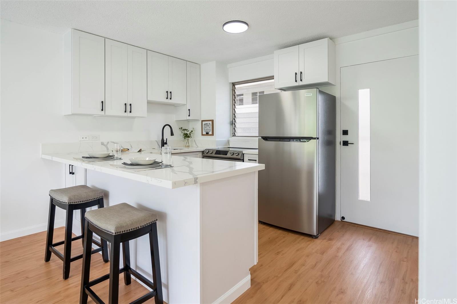 | iscover urban elegance in the heart of Honolulu. Nestled in Punahou Wilder, this 2 bed, 1 bath condo marries modern living with central convenience. Undergoing a meticulous transformation in 2023, this unit's sleek design is highlighted by its open spaces featuring luxury vinyl wood floors juxtaposed against tasteful black accents. The chef-inspired kitchen boasts calcatta quartz counters, new appliances and white shaker cabinets, leading to a spacious peninsula island - a culinary enthusiast's dream. Continuing the modern motif, the bathroom exudes opulence with a contemporary shower and a cascading waterfall head. Step out to your sizable covered lanai for the lush backdrop of the Manoa mountains and experience the comfort of cool valley breezes in this well-ventilated haven. Finally, enjoy the building's amenities, secure access, and prime location as you're situated moments away from the freeway and popular points of interest in Honolulu. Don't delay and miss your chance at this coveted gem! | What will it cost to own? | |