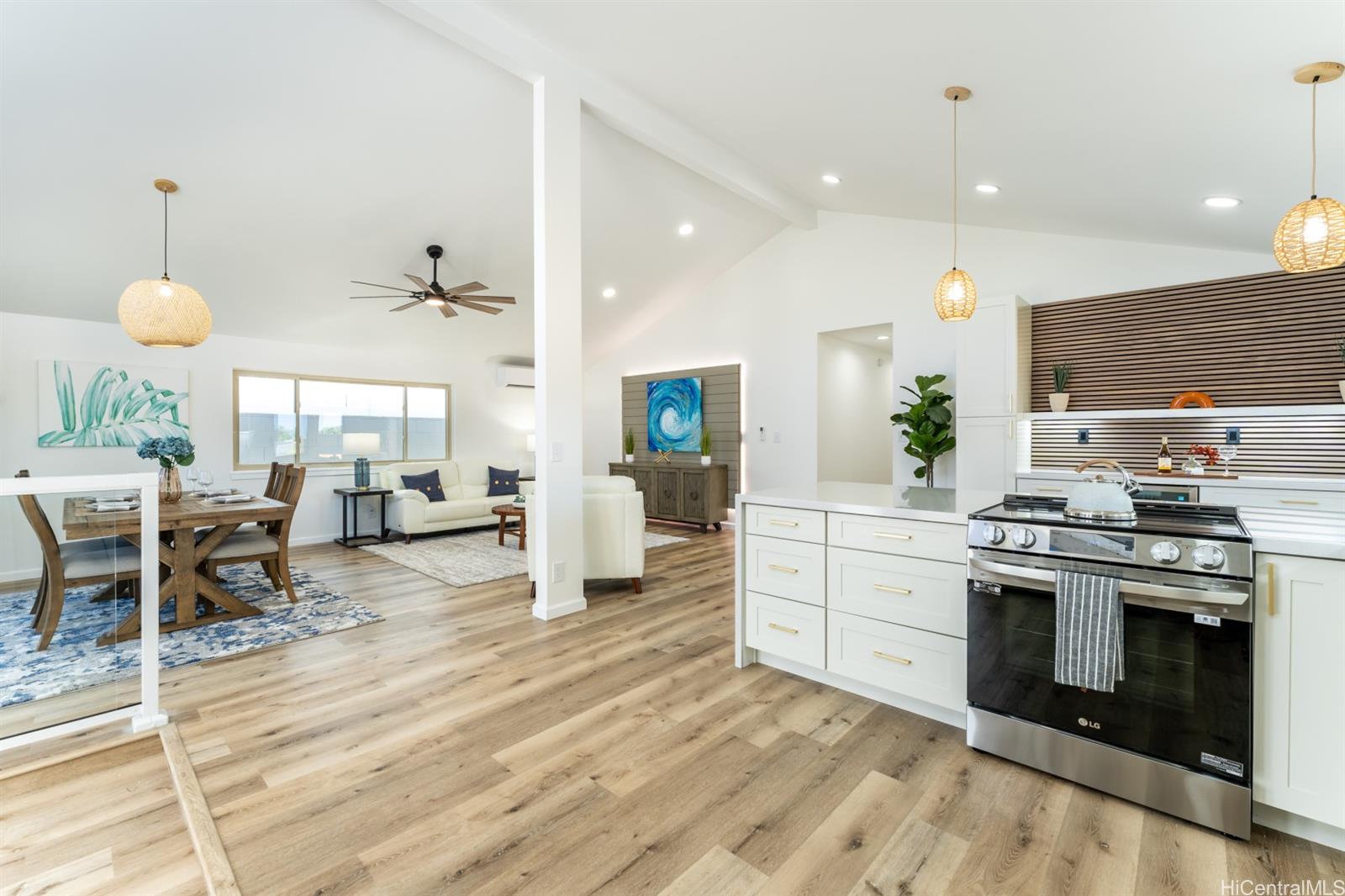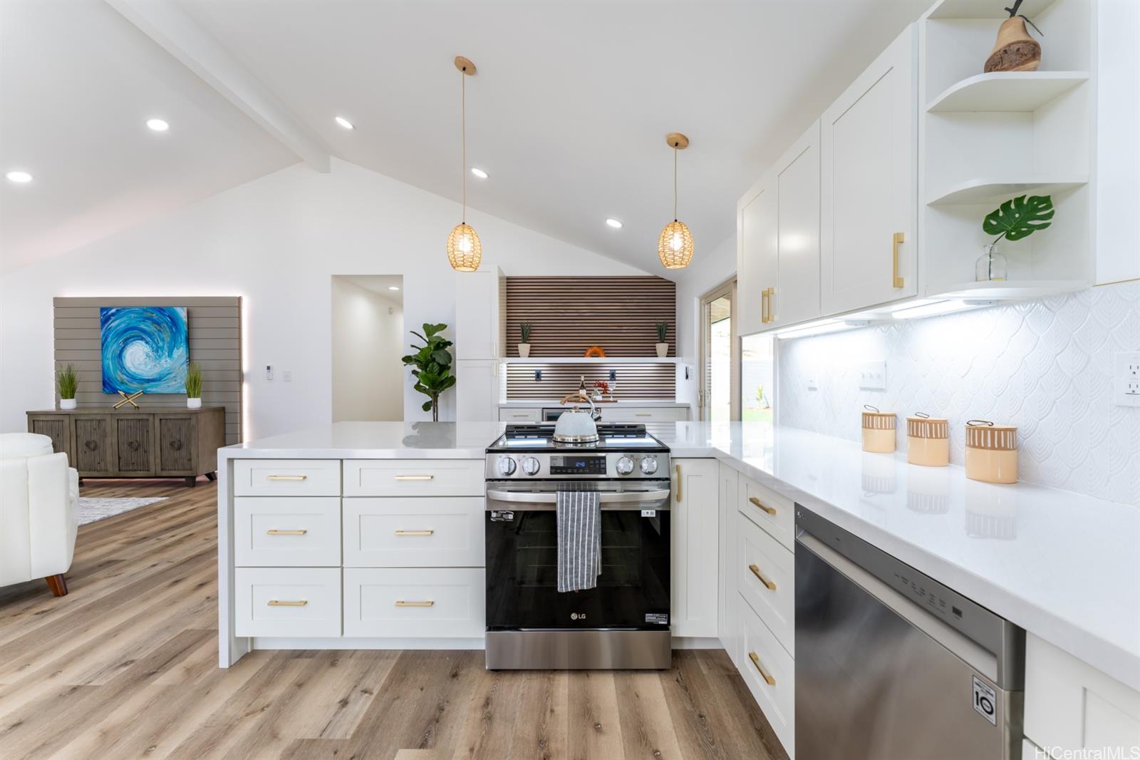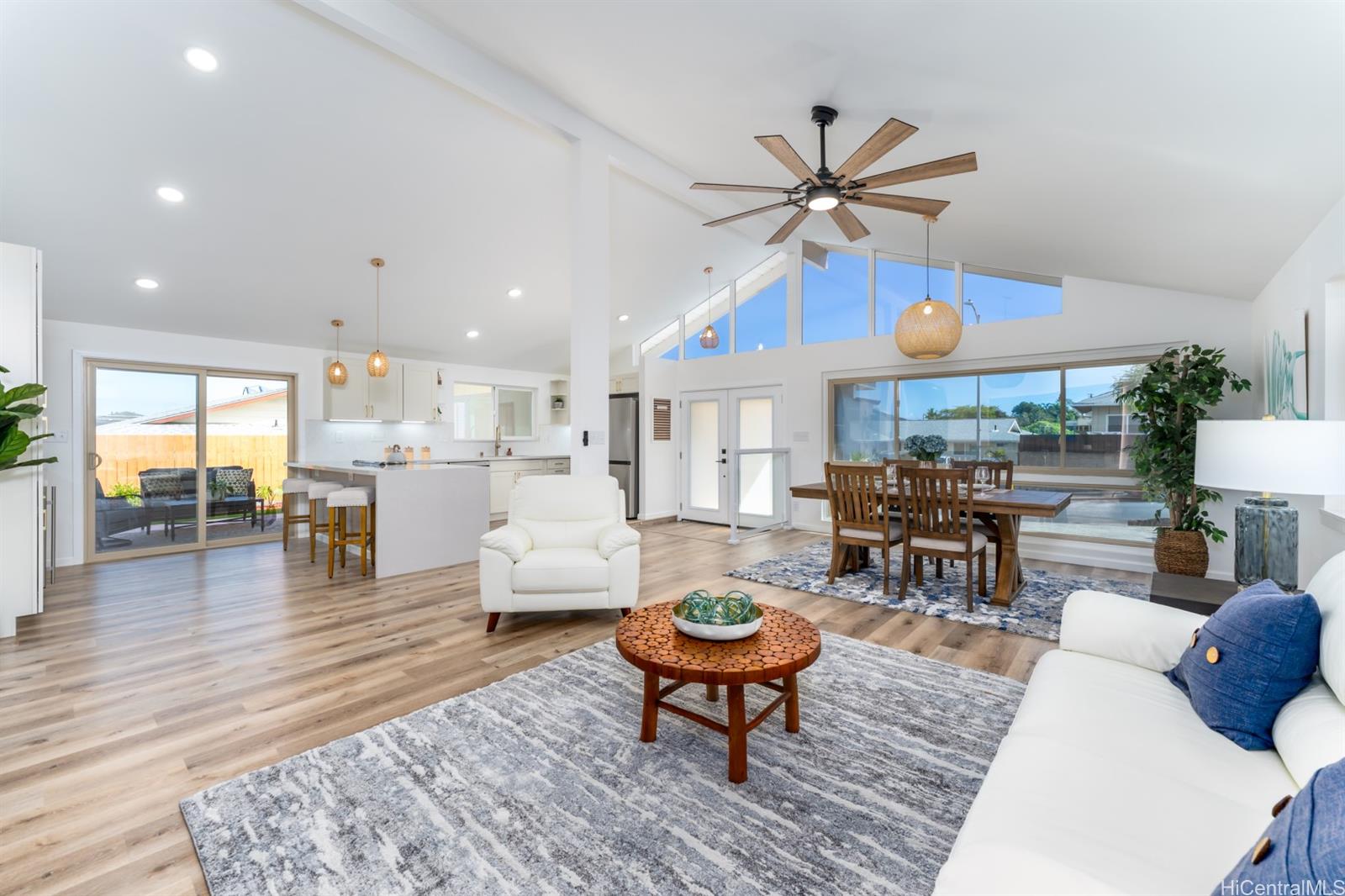 | ome home to this fully renovated 3 bedroom 2 bath home in the sought-after Keolu Hills neighborhood. As you enter the home through the glass doors (tinted for privacy) you will find a spacious vaulted ceiling great room that opens to the kitchen and dining areas with all new appliances. Quartz countertops, ecru cabinets and wood accents throughout the home provide some of the many stylish unique enhancements. The ceiling fans, split ACs and solar attic fan have been added for efficient comfort. The exterior is updated with new landscaping, large covered patio, additional wood accents, tiled pillars and a fenced yard. To complete this renovation is a new roof of asphalt shingles. | What will it cost to own? | |