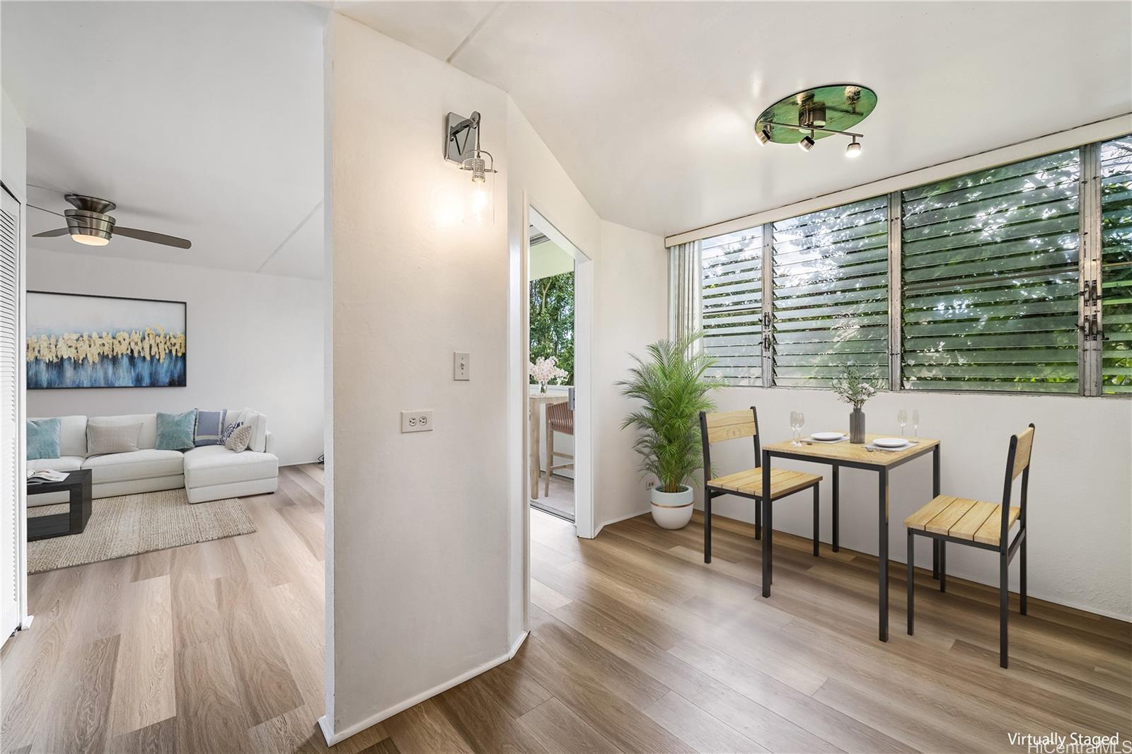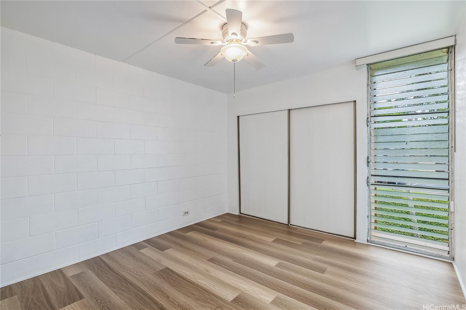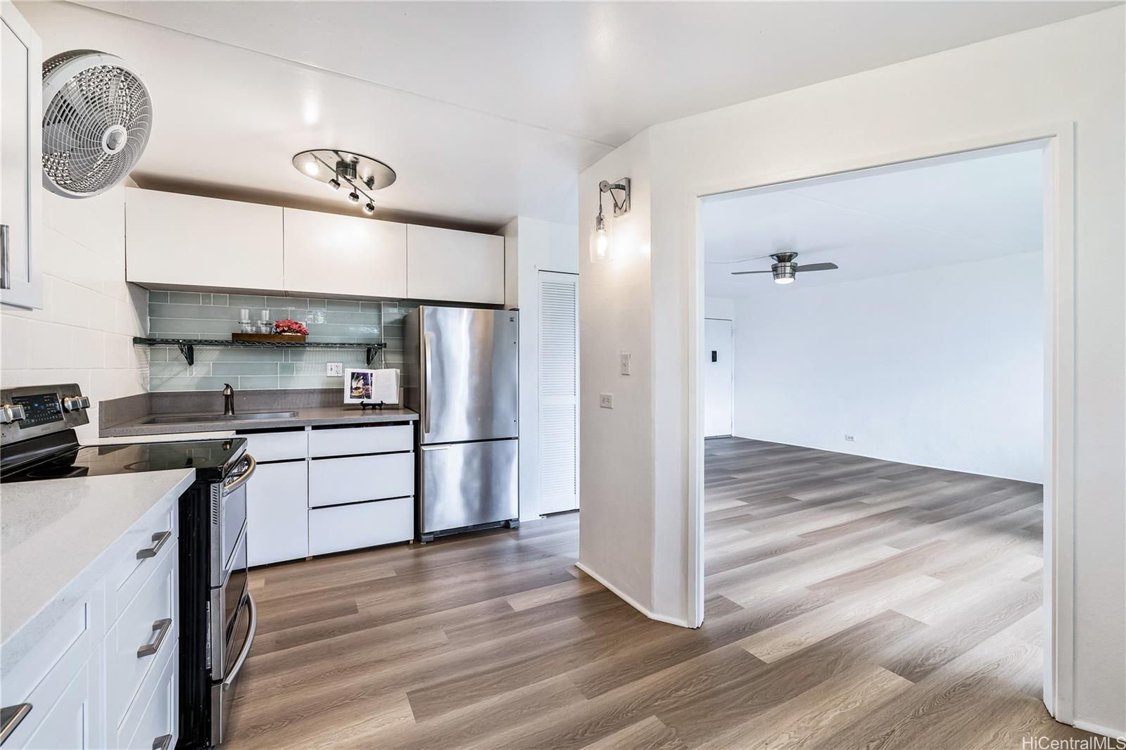 his charming 2 bedroom, 1 bath home is move-in-ready and located in the desirable community of Mililani. You will love the open concept kitchen with upgraded cabinets, quartz countertops, stainless steel appliances, tankless water heater, new luxury vinyl plank flooring, washer/dryer, assigned parking and additional guest parking for visitors. Enjoy cool evenings sitting on your lanai overlooking the grassy courtyard. Hokuahi Apartments is pet friendly, VA eligible, convenient to Safeway, Longs, schools, shopping, theater, and restaurants. Your association fees include access to the Mililani Neighborhood Recreation Centers! The photos have been virtually staged. Please watch the video!