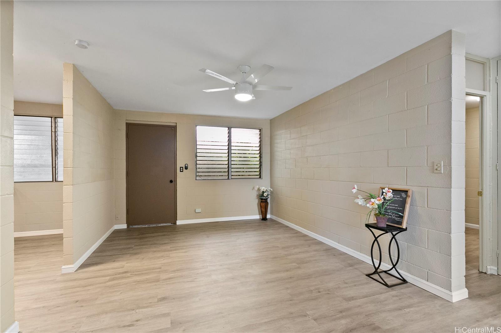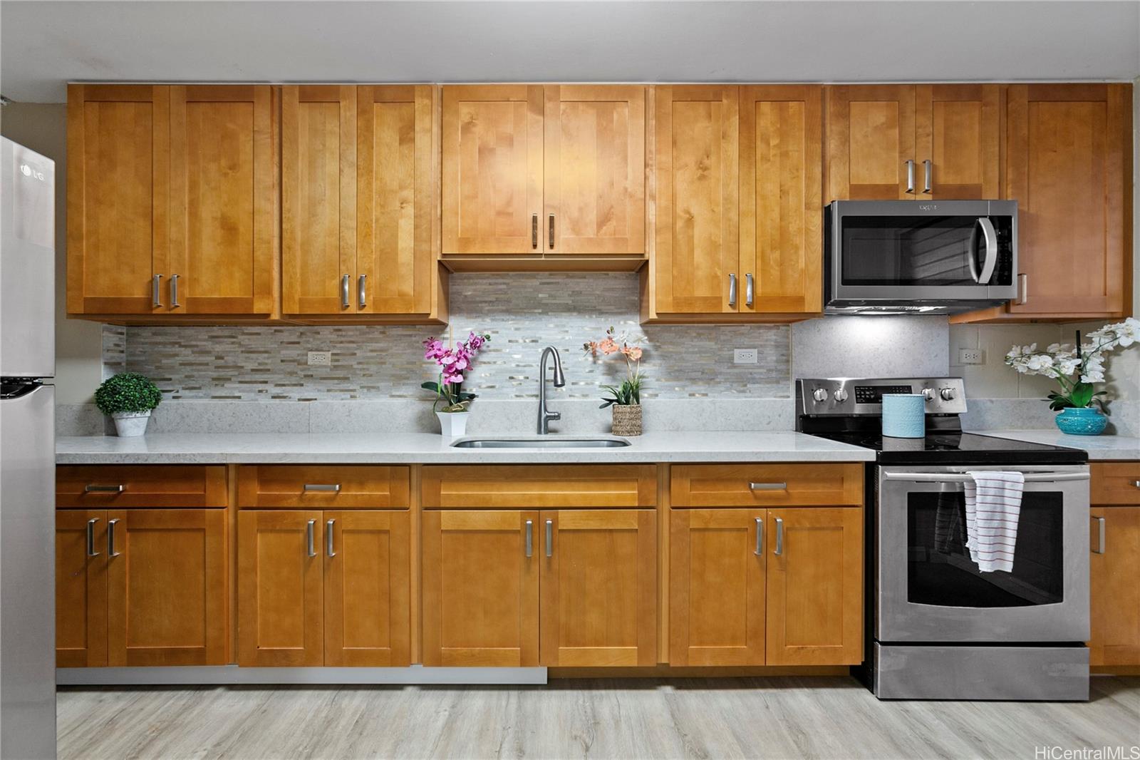 reat value in this Starter Home or Investment....PRICED TO SELL! Ground Floor 3BR, 1BA unit in a Gated Community. Unit includes 1 assigned open parking stall, window A/C units and Leased PV. It features a completely renovated kitchen with quality cabinets and quartz countertops. POPCORN CEILING REMOVED. Brand new microwave hood & refrigerator. Brand new LVP flooring throughout the unit. Brand New ceiling fan, light fixtures, AND mirrored closet doors. Centrally located, close to shops, supermarkets, bus stops, rail, restaurants, churches and more. Great for first time home buyers or investors. Sold As Is.
