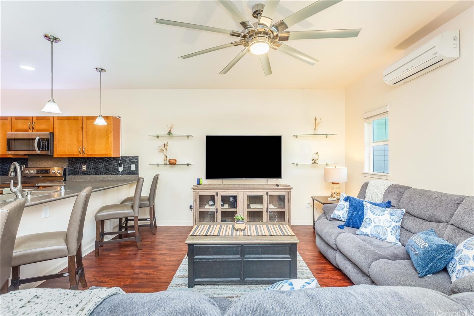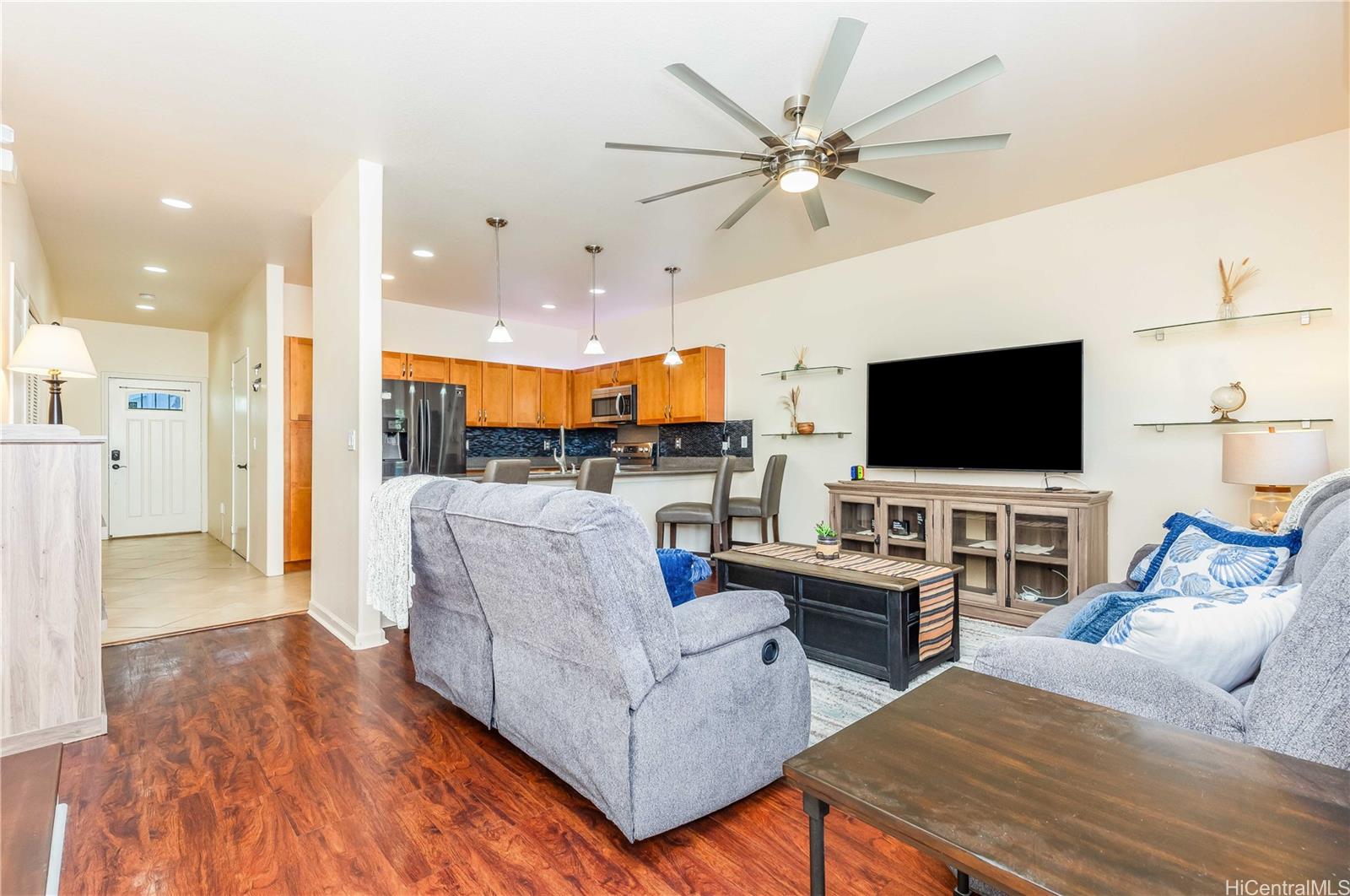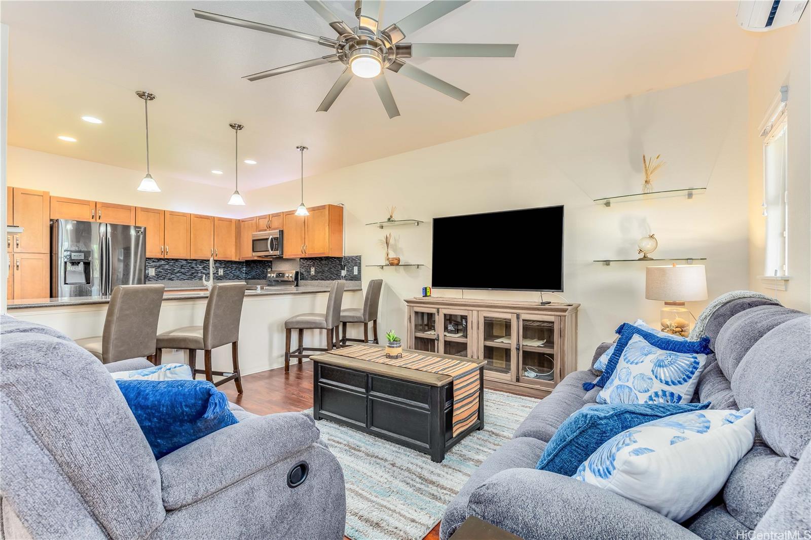 | elcome Home to Pulewa at Mehana Built in 2011, this multi-level 3 bedroom 2 full and 1 half bath townhome offers the comforts of an attached garage with driveway parking, covered ground floor entries, full-sized front loading high efficiency washer dryer in unit, a ground floor half bath, an open concept kitchen dining and living areas - perfect for entertaining, a covered lanai off of the primary bedroom and split ACs throughout the home. Nestled on a tree lined street with parking, this home is situated near many conveniences - there is a designated guest stall facing the unit; Mehana MAC center with a pool and an exercise room is about a block away; Mehana Sundial Park is about a half block away; and numerous local businesses are located throughout the neighborhood in close proximity; Ho'okele Elementary is approximately a block away and lastly across Fort Barrette Road is Kapolei High School.