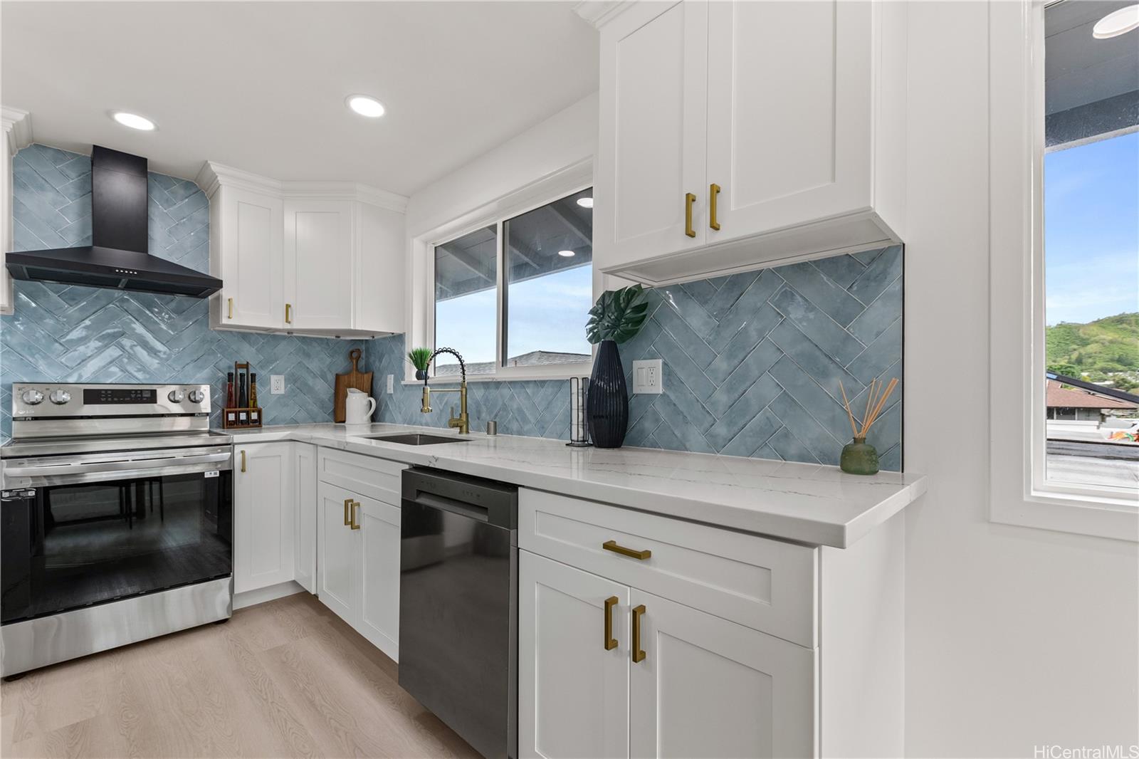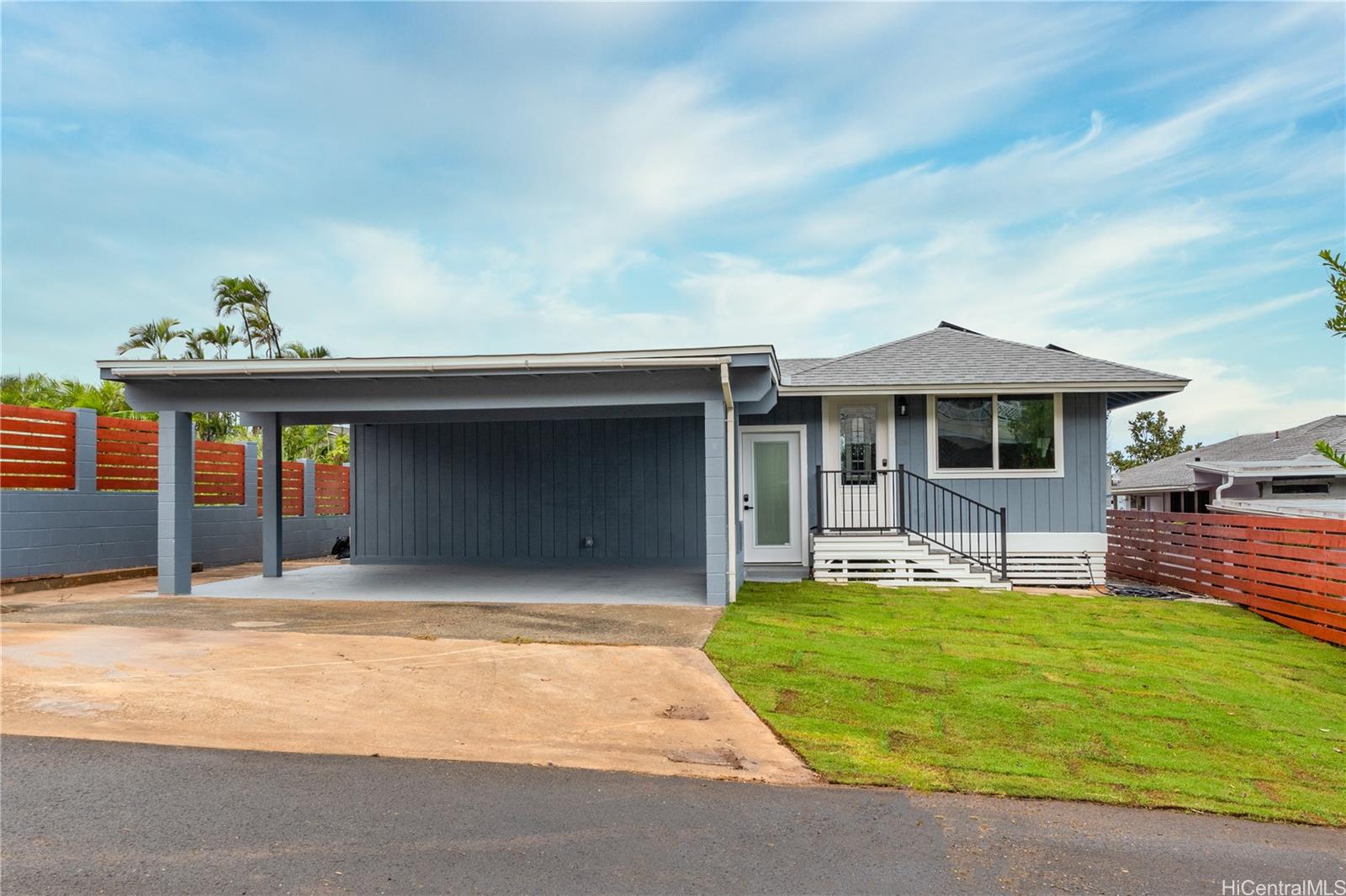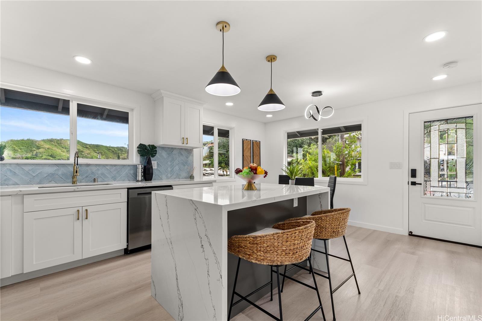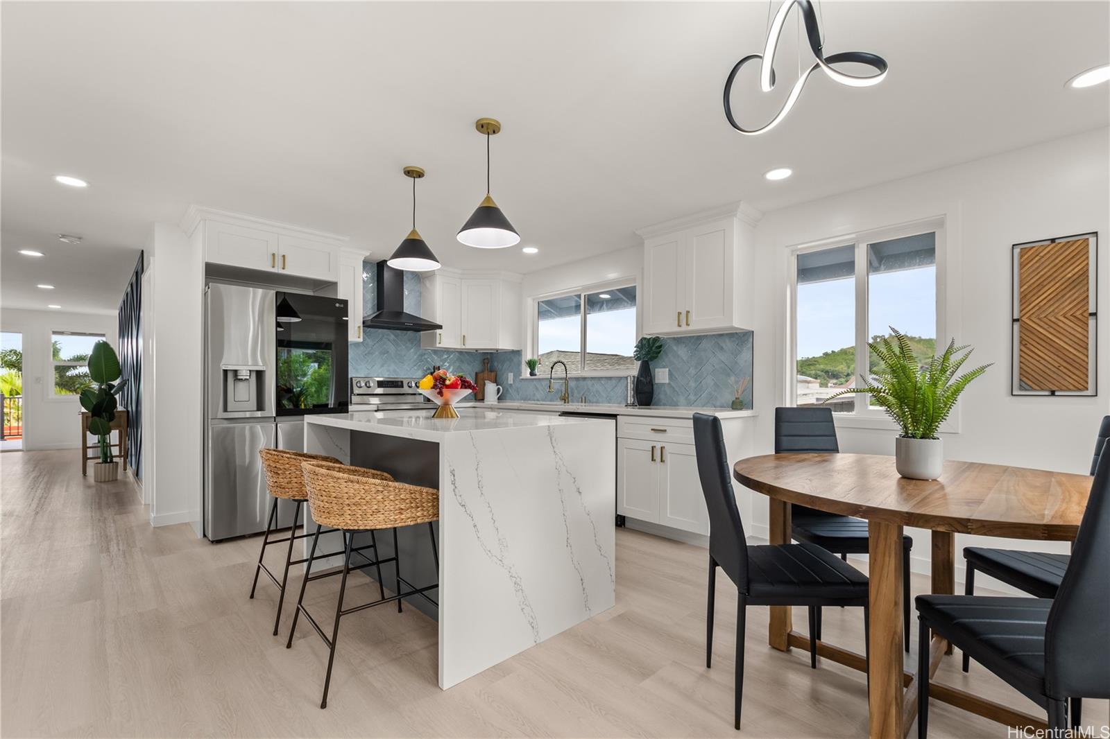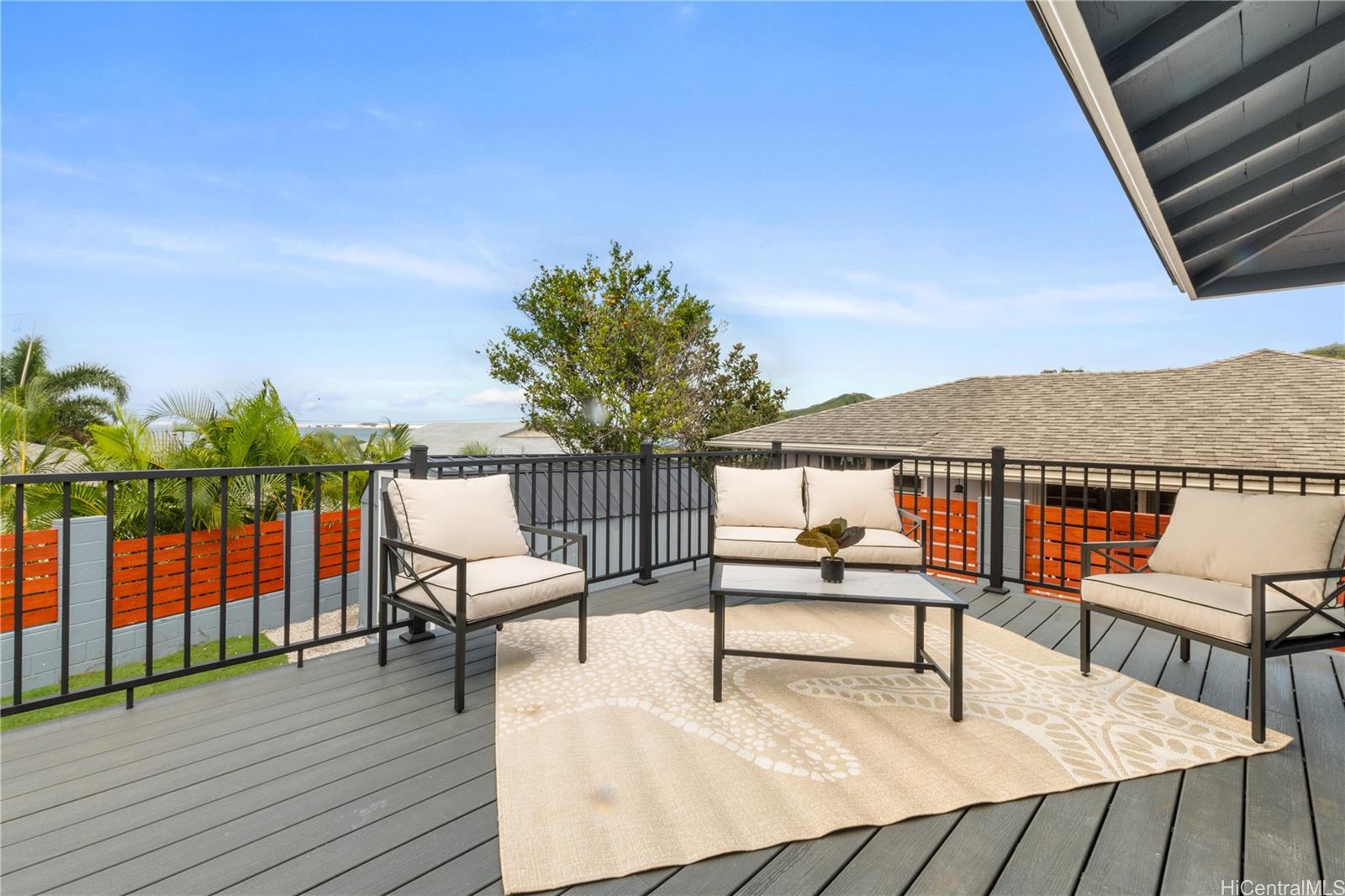 ULTI GENERATIONAL LIVING IN KANEOHE! Nestled into the Mikiola Hillside and designed for exceptional Kaneohe Bay & ocean views from virtually every room, this meticulously cared for home has been beautifully updated. This impressive layout includes a (3) bed / (2) bath in the main house & (1) bed / (1) bath in the attached unit, perfect for extended Ohana or added rental income. The home also has a brand new roof, 16 leased solar panels with brand new solar framing to keep your utility bill low, brand new luxury vinyl flooring and an abundance of natural light enhances this wonderfully open floor plan. Greet your guests into the open gourmet kitchen with a grand Quartz island, brand new windows in the spacious living room that opens up to the custom designed 400+ sqft lanai (perfect for morning coffee, making indoor and outdoor living a breeze)! All new appliances (toilets with bidet), split A/C system in every room, custom designed accent walls, and open concept layout perfect for entertaining friends and family. This impressive home was created for family enjoyments as well as the option to separate the (2) units for added rental income.