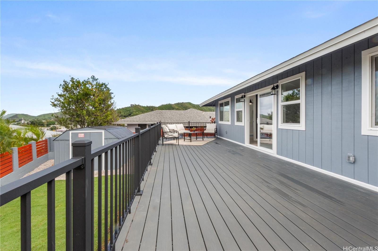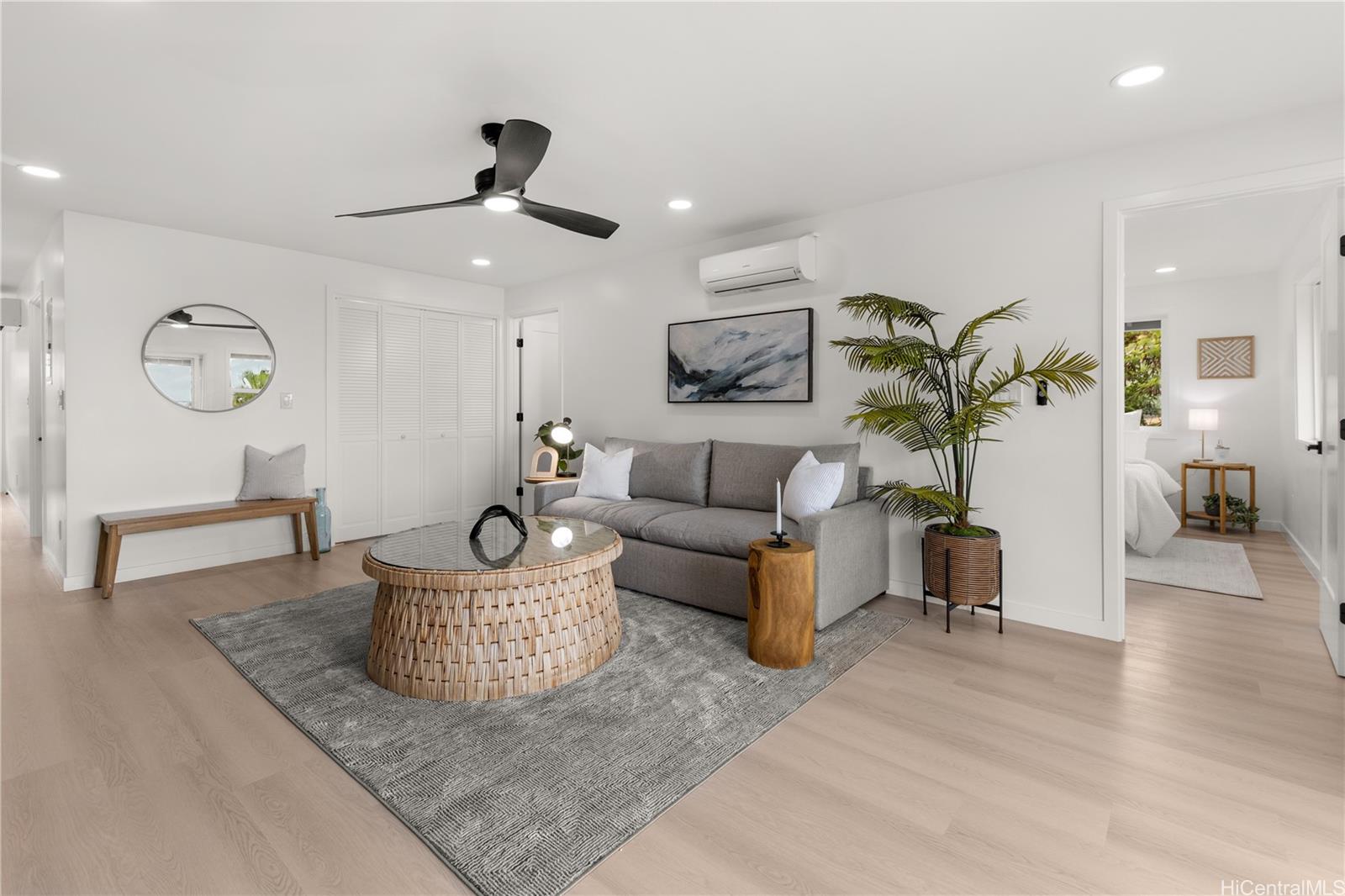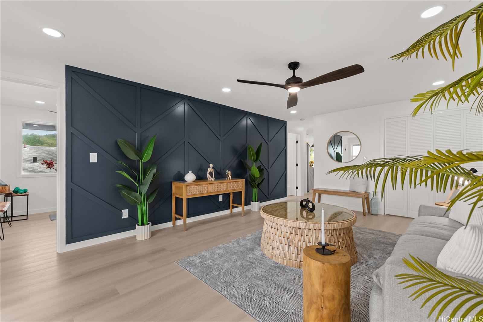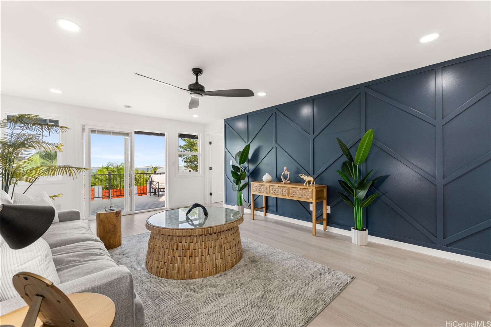 ULTI GENERATIONAL LIVING IN KANEOHE! Nestled into the Mikiola Hillside and designed for exceptional Kaneohe Bay & ocean views from virtually every room, this meticulously cared for home has been beautifully updated. This impressive layout includes a (3) bed / (2) bath in the main house & (1) bed / (1) bath in the attached unit, perfect for extended Ohana or added rental income. The home also has a brand new roof, 16 leased solar panels with brand new solar framing to keep your utility bill low, brand new luxury vinyl flooring and an abundance of natural light enhances this wonderfully open floor plan. Greet your guests into the open gourmet kitchen with a grand Quartz island, brand new windows in the spacious living room that opens up to the custom designed 400+ sqft lanai (perfect for morning coffee, making indoor and outdoor living a breeze)! All new appliances (toilets with bidet), split A/C system in every room, custom designed accent walls, and open concept layout perfect for entertaining friends and family. This impressive home was created for family enjoyments as well as the option to separate the (2) units for added rental income.