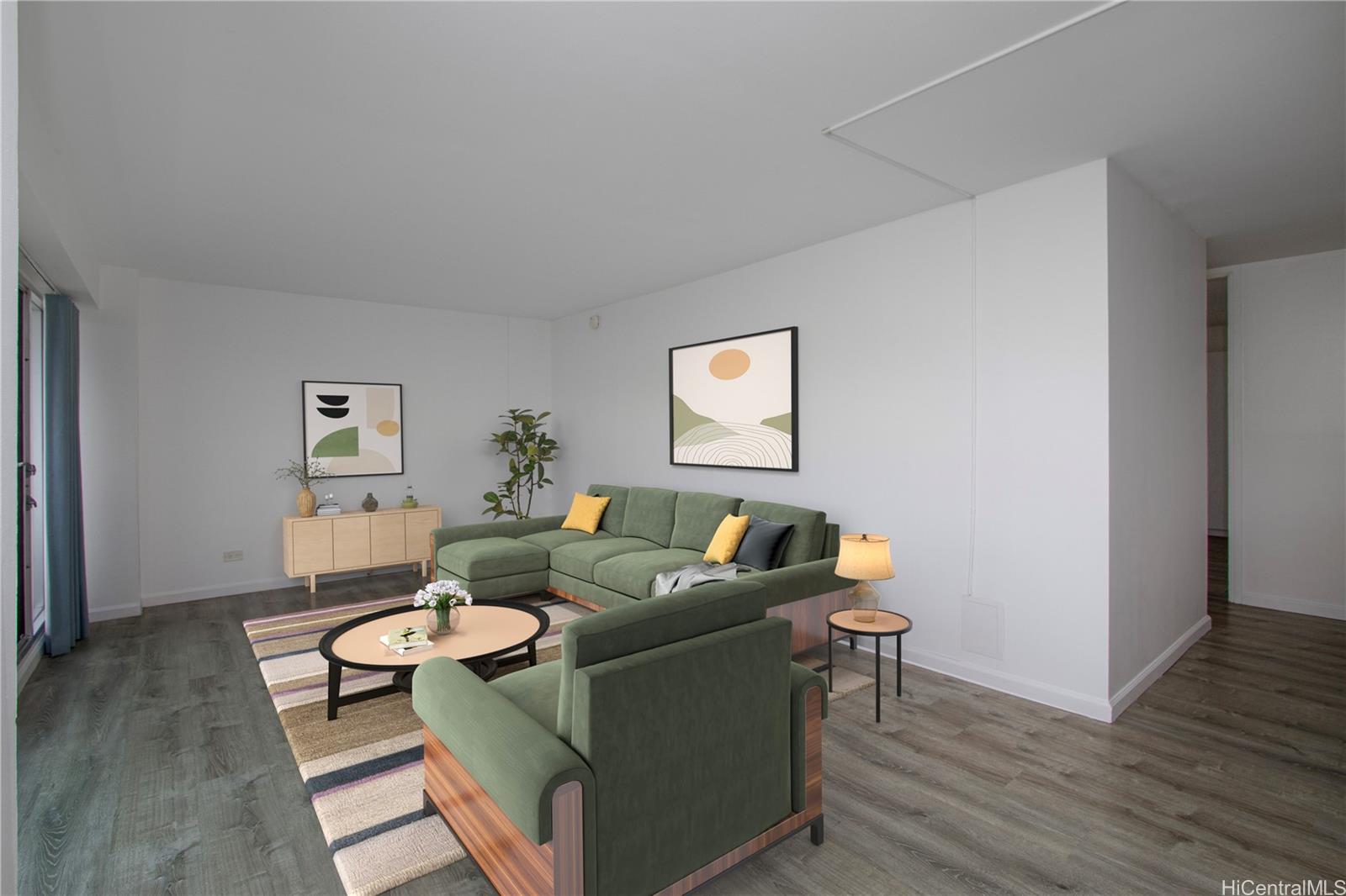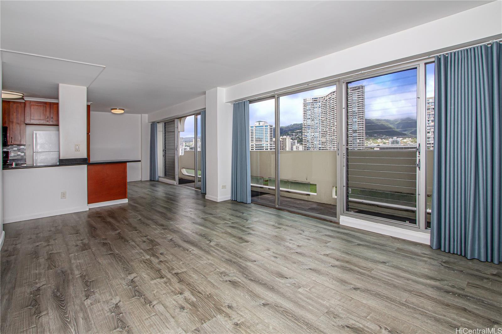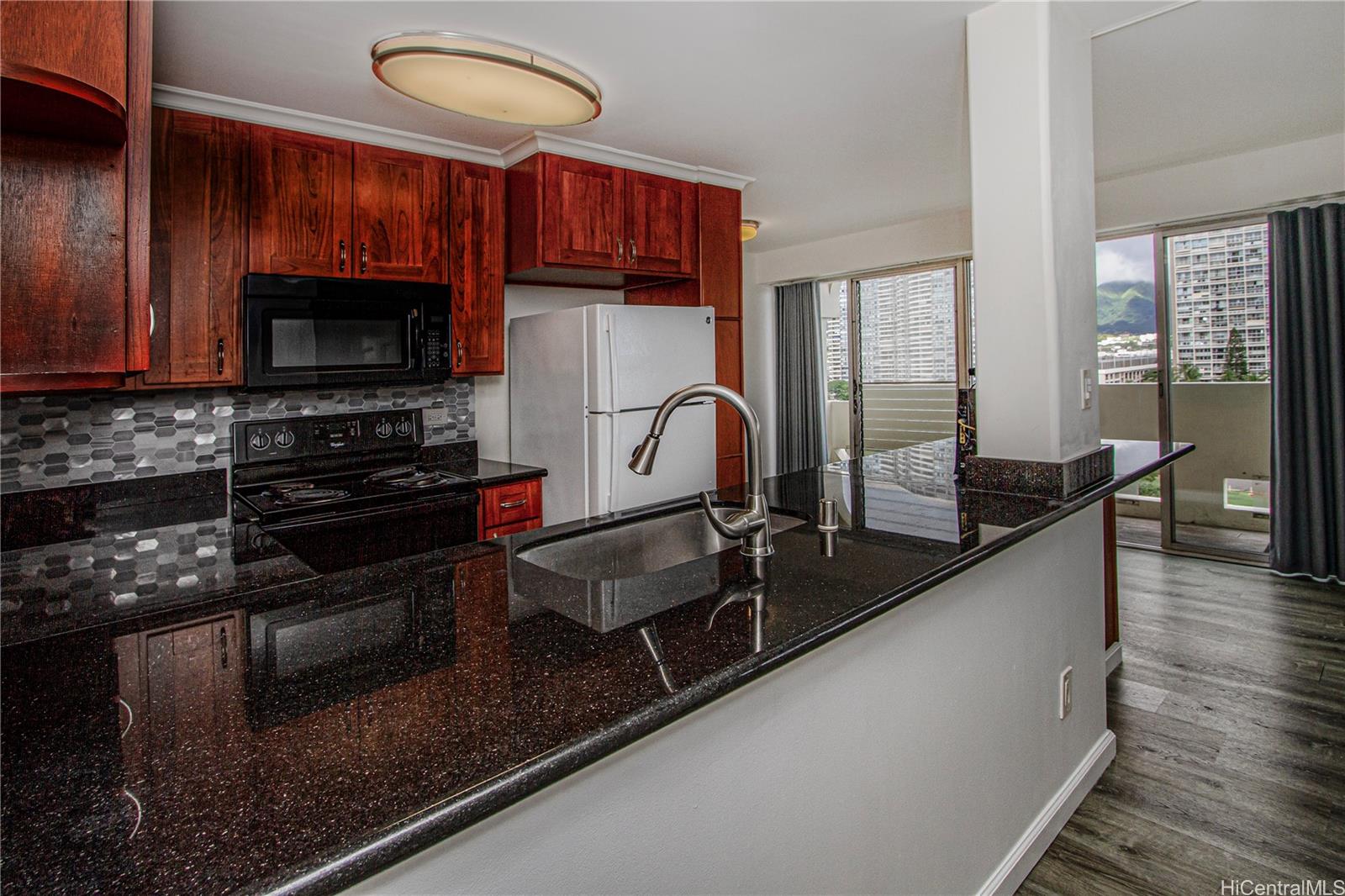 | anoramic views of the Ala Wai and Honolulu cityscape from this 2-bedroom, 2-bath Twin Towers residence. This spacious unit has a remodeled kitchen that has been opened up to allow for more counter space, and features granite countertops, hardwood cabinets, and a stacked washer and dryer. Relax on your covered lanai of over 100 square feet which spans the length of your unit or entertain guests poolside. The windows allow for ample light and cool ventilation throughout. With only 4 units per floor, this secured building allows for privacy and comes with 1 assigned parking stall. Conveniently located near Waikiki beaches, shops, and restaurants. | What will it cost to own? | |